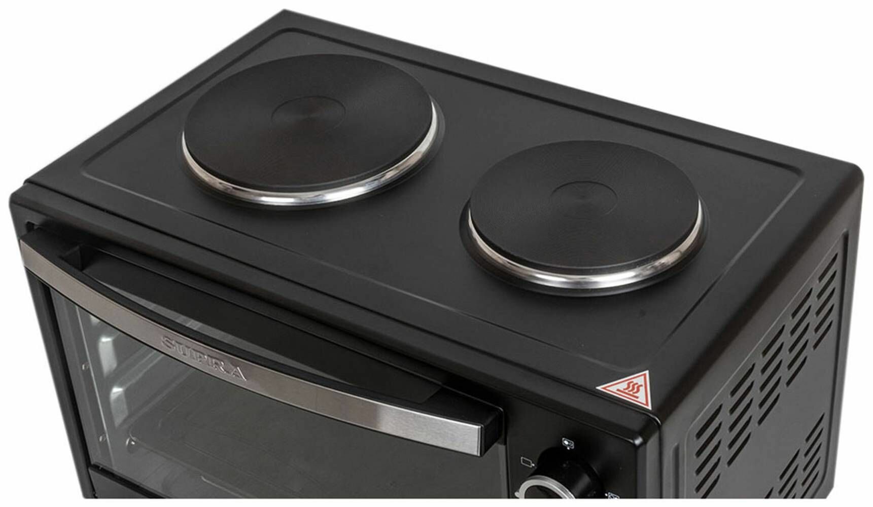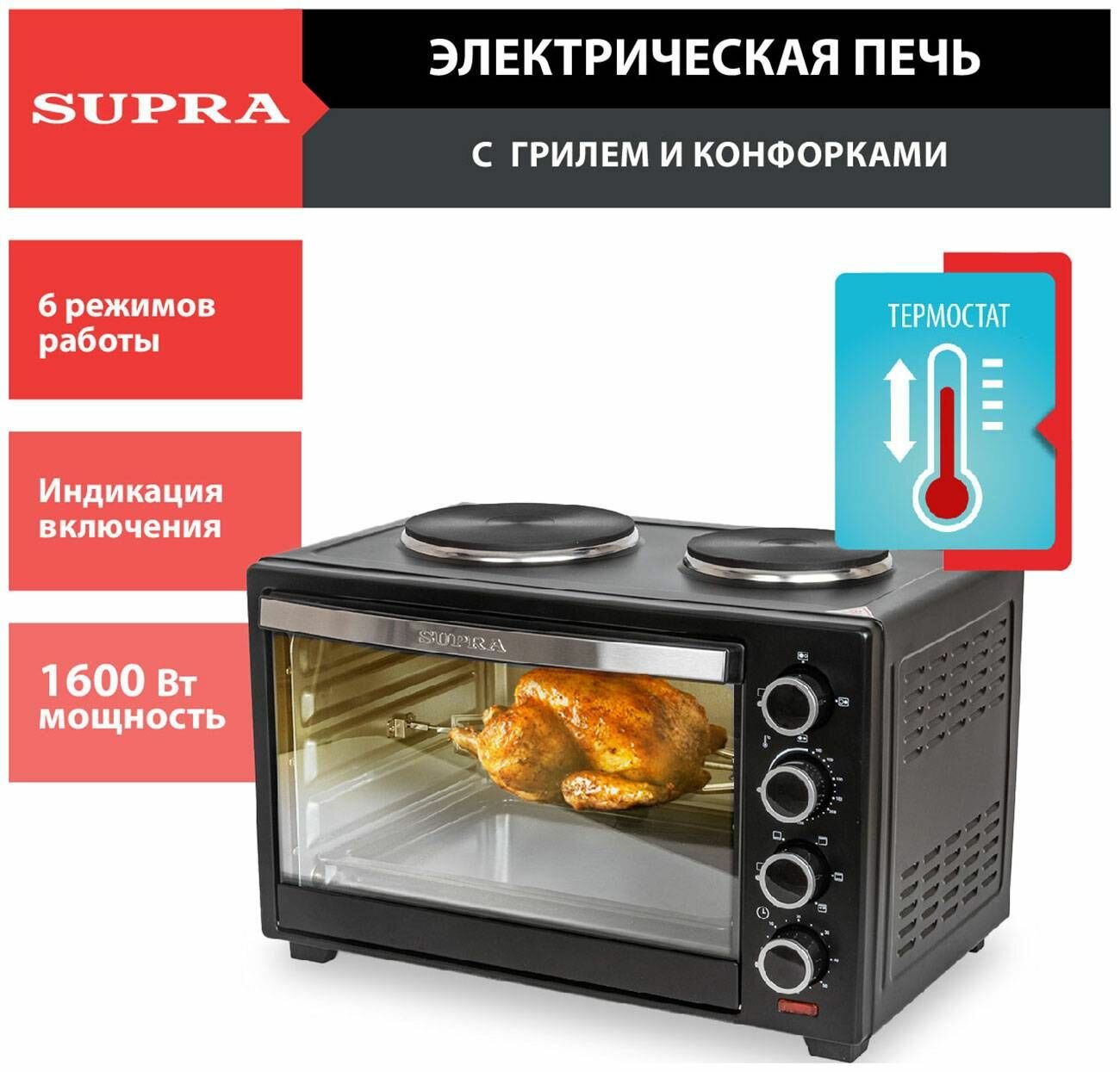 Печь электрическая SUPRA 42 литра с грилем, 2 конфорки, 6 режимов работы / мини-печь с вертелом, таймер 60 минут, 1600 Вт