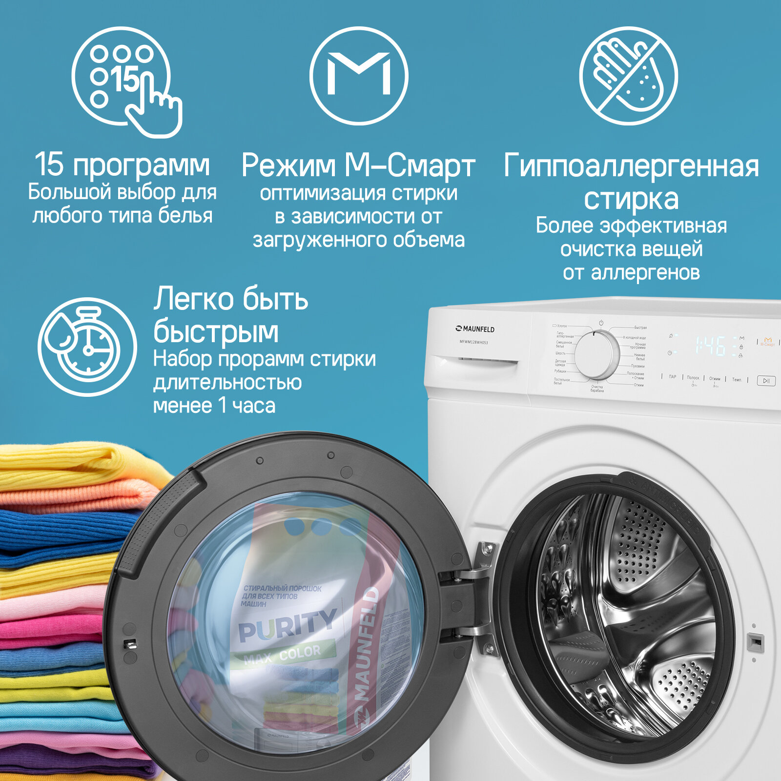 Ниже Вы можете прочитать отзывы на Стиральная машина MAUNFELD MFWM128WH053 c инвертором и паром, 15 режимов, 7.5 кг загрузка, 1200 оборотов, блокировка от детей, отложенный старт, Inverter PowerDrive, 3 года гарантии, ознакомится с подробными характеристиками, посмотреть интересные обзоры и фотографии на Стиральная машина MAUNFELD MFWM128WH053 c инвертором и паром, 15 режимов, 7.5 кг загрузка, 1200 оборотов, блокировка от детей, отложенный старт, Inverter PowerDrive, 3 года гарантии.