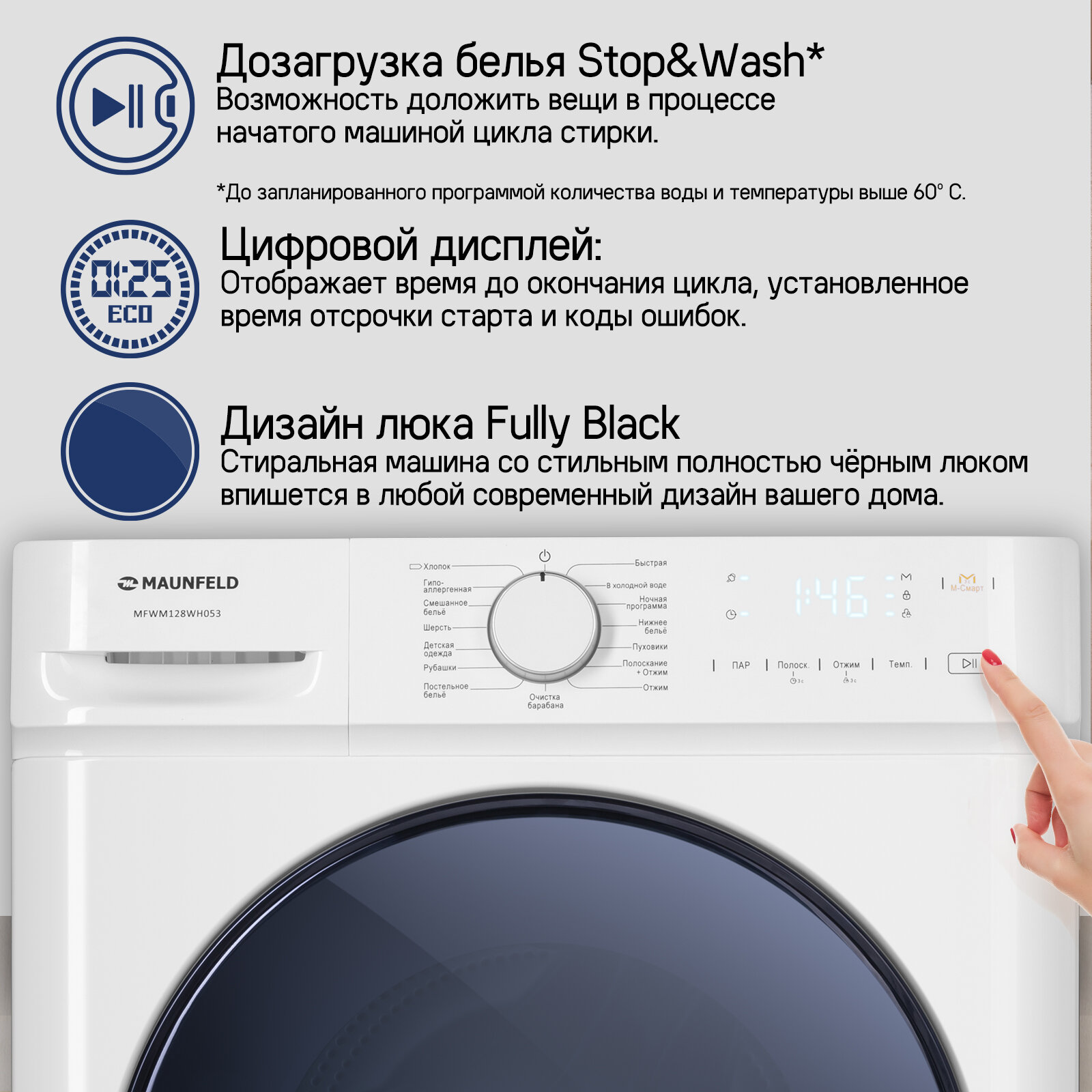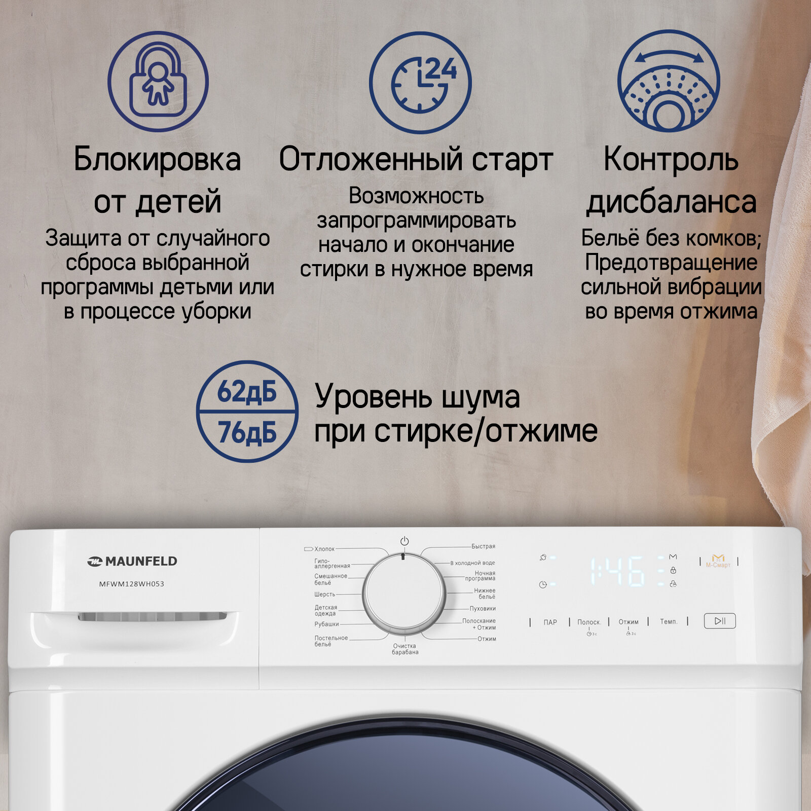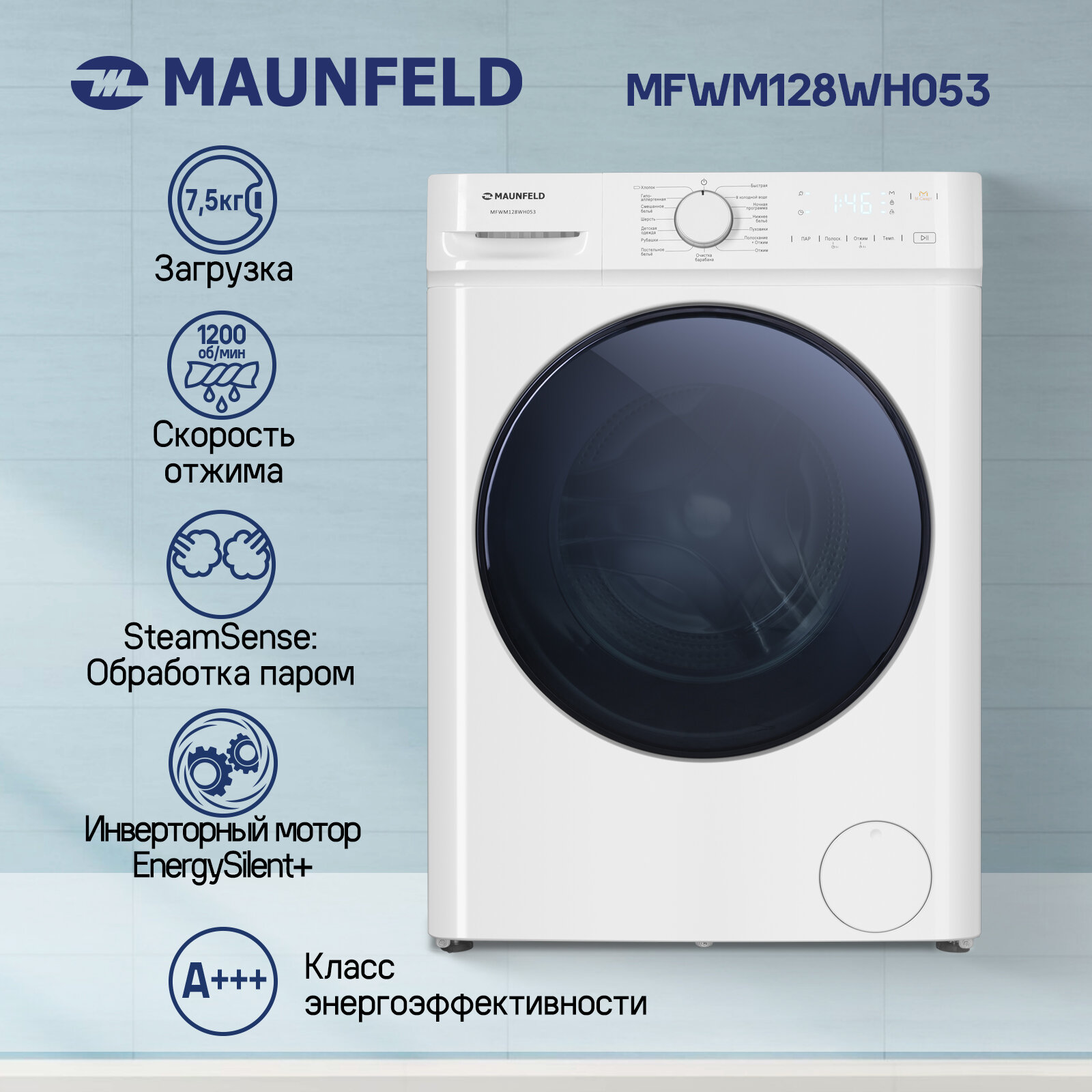 Купить Стиральная машина MAUNFELD MFWM128WH053 c инвертором и паром, 15 режимов, 7.5 кг загрузка, 1200 оборотов, блокировка от детей, отложенный старт, Inverter PowerDrive, 3 года гарантии