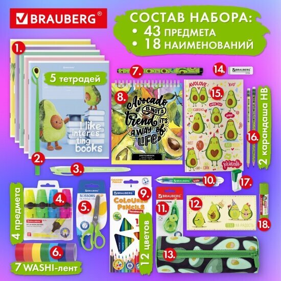 Набор канцелярии подарочный BRAUBERG "AVOCADO", 18 наименований, 43 предмета, 880951