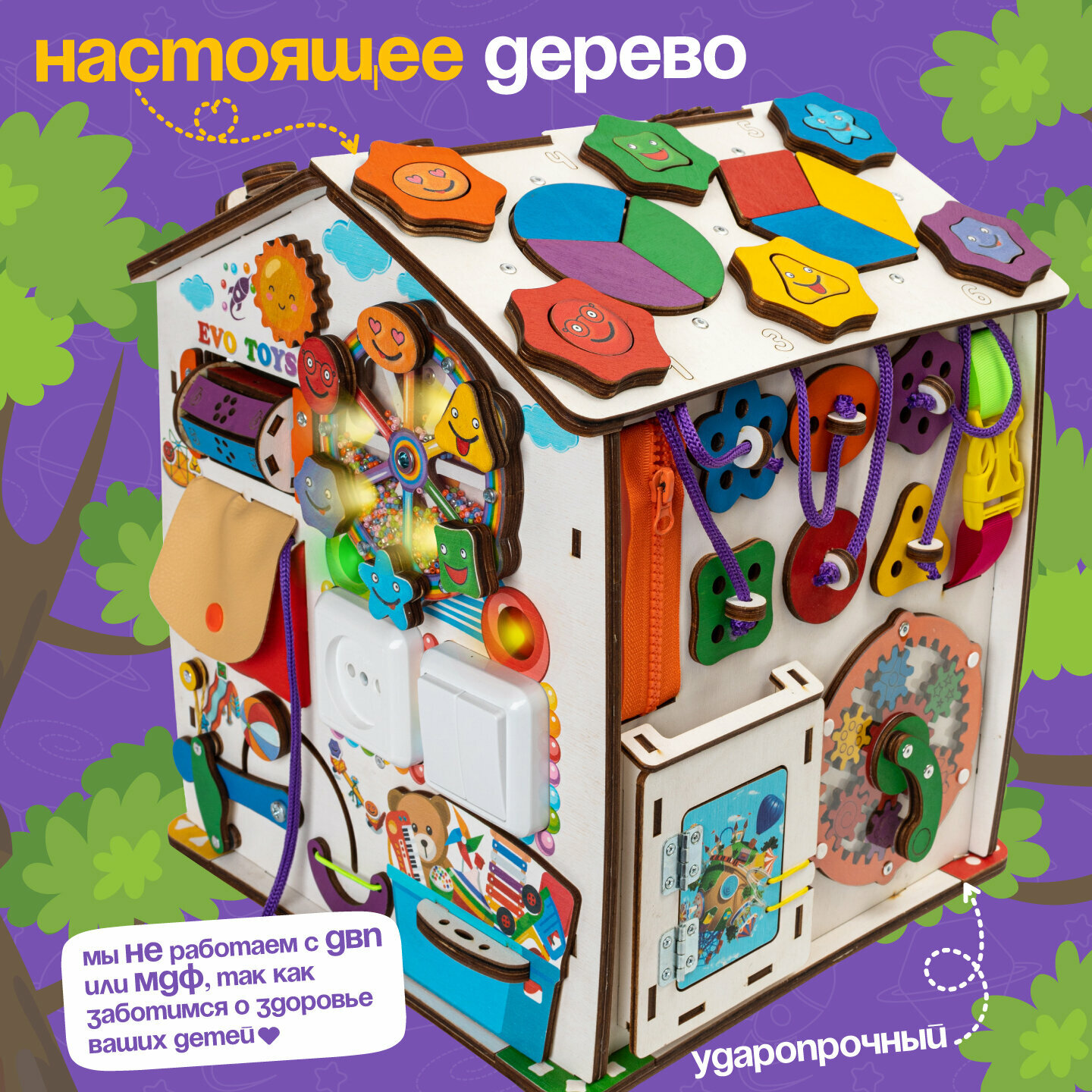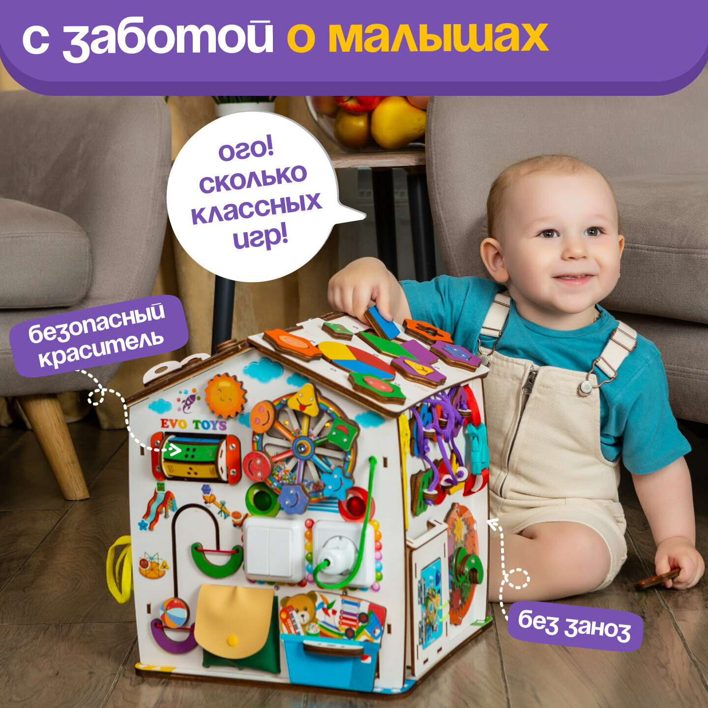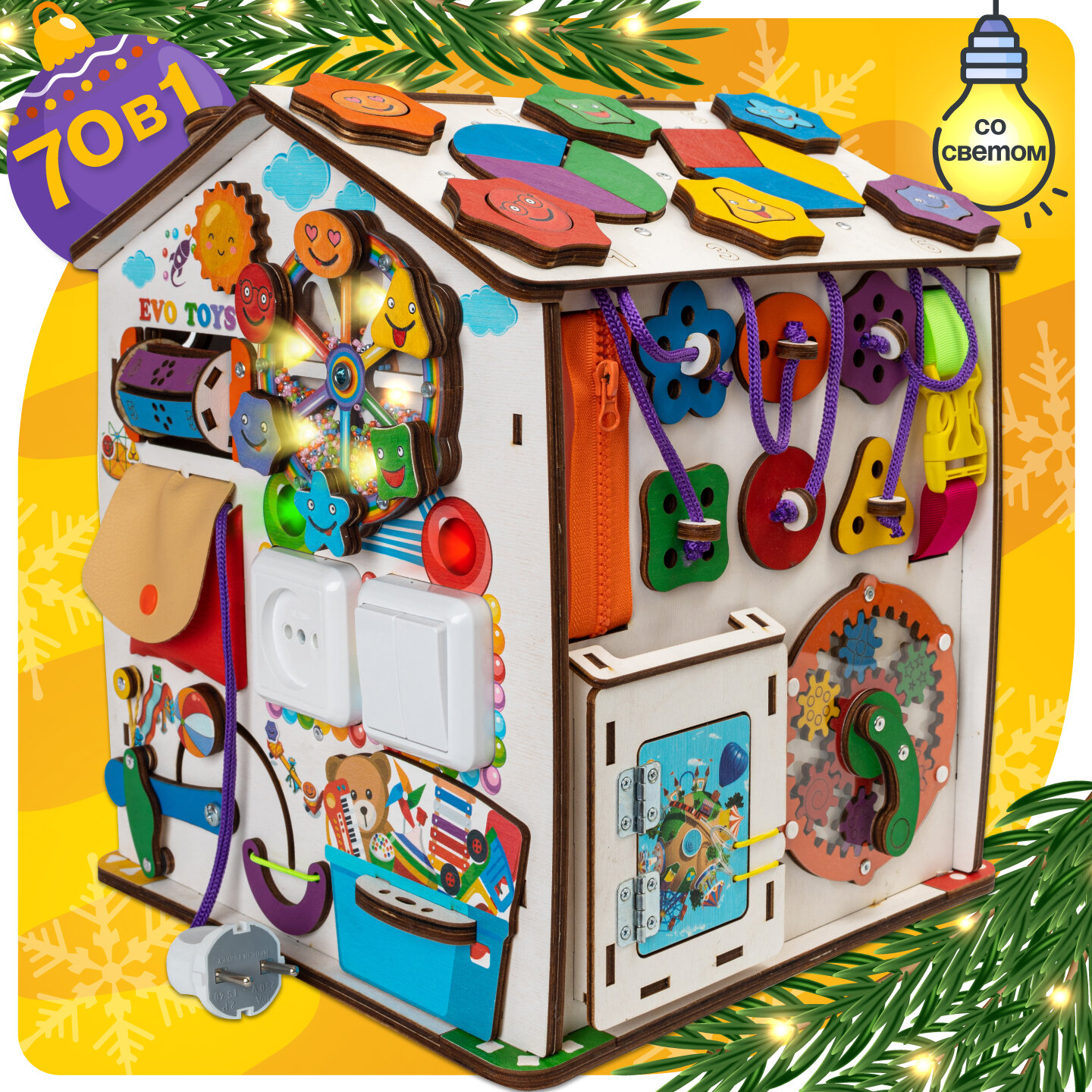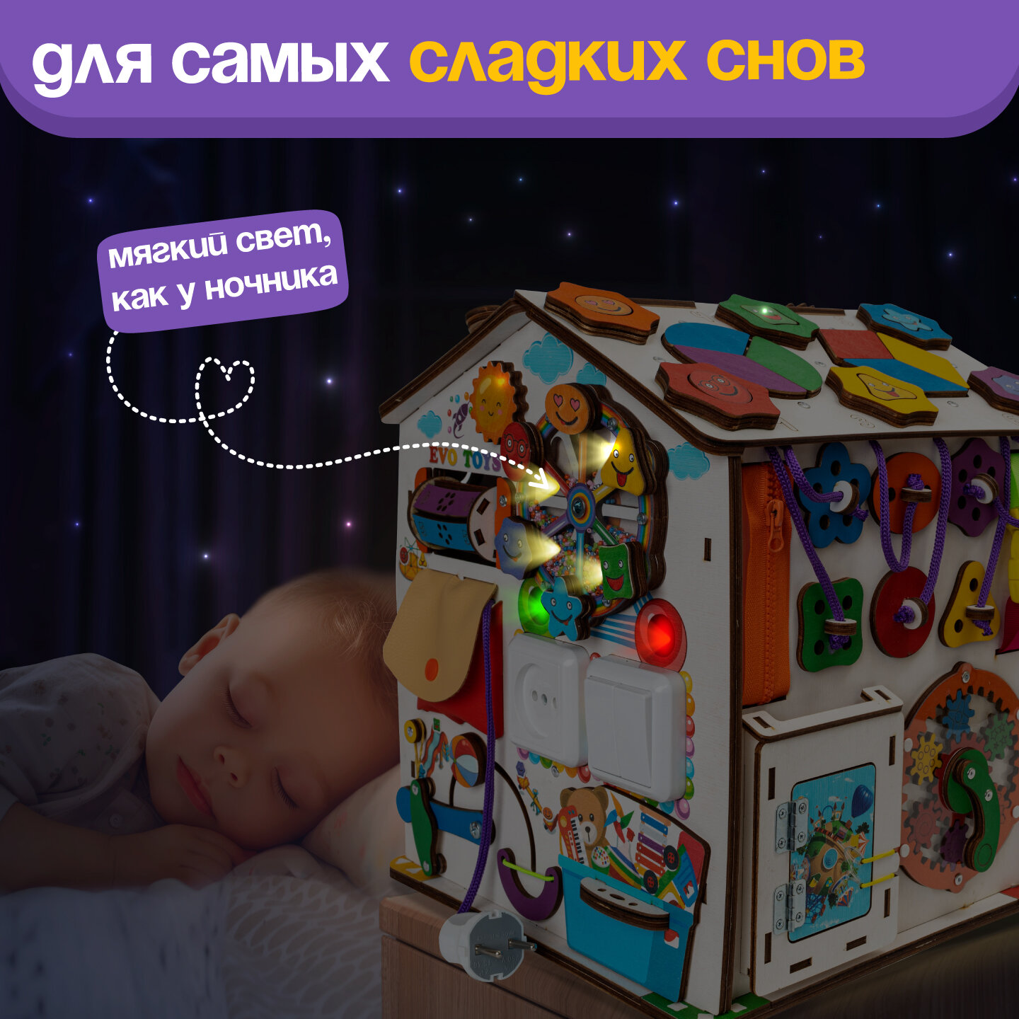 Купить Бизиборд развивающий домик Evotoys Смайлики на аттракционе 29х36 см со светом
