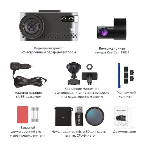 | Дополнительная информация | Комплектация:Комбо-устройство, Камера заднего вида, Адаптер питания iBOX Power Cord USB C2 4м, Поворотное магнитное крепление на присоске с активным питанием и подключением камеры заднего вида, CPL-фильтр, Инсталляционный комплект, Предохранители, Элемент крепления на 3М скотче, запасной 3М скотч, Адаптер для карты памяти micro SD, Чехол |