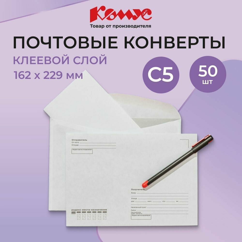 Купить Конверты бумажные почтовые Комус, С5, 162x229 мм, декстрин, 50 штук