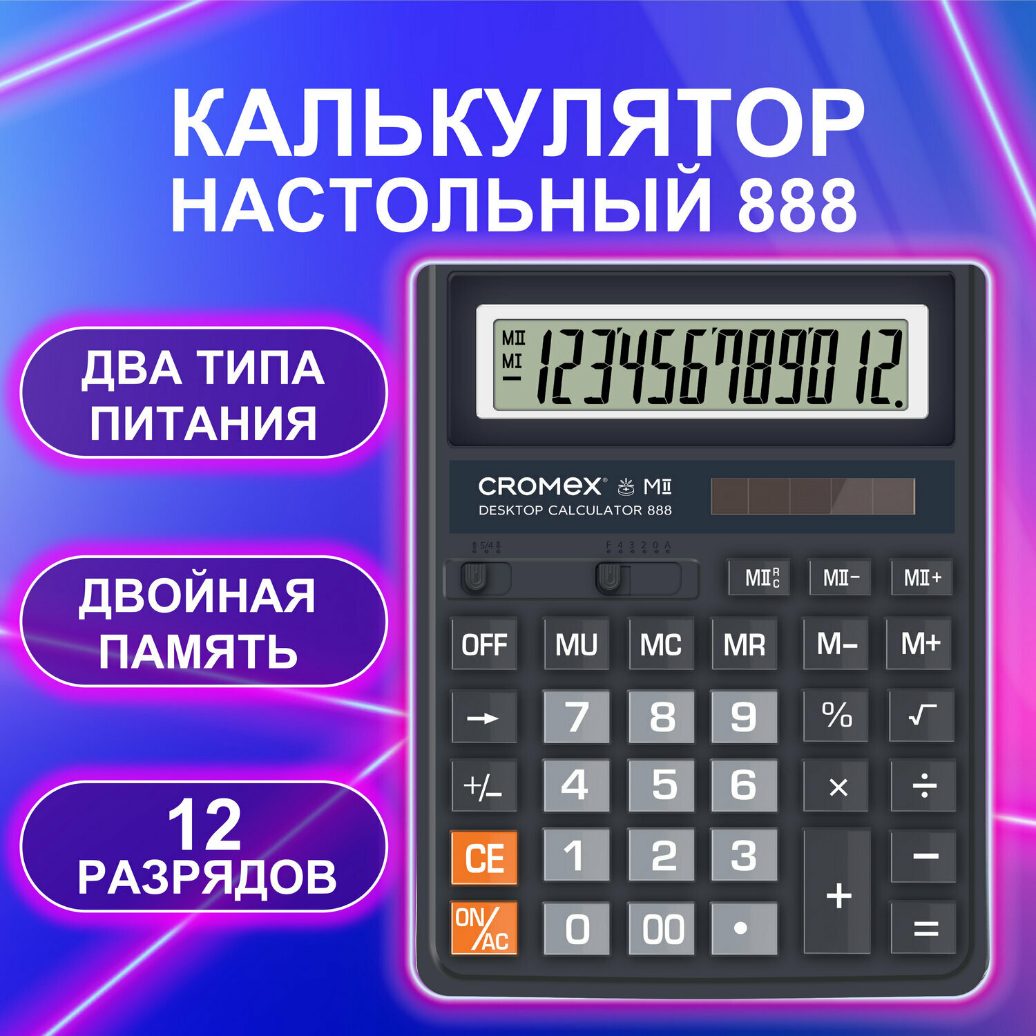 Купить Калькулятор настольный большой 12 разрядный бухгалтерский для школы и офиса, 185x145 мм, большие кнопки, двойное питание, черный, Cromex 888, 271728