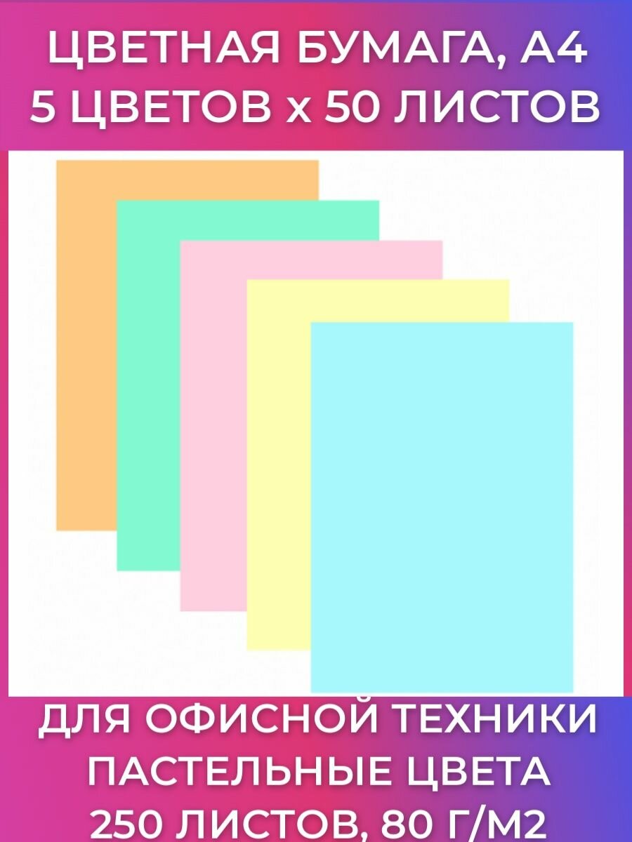 Бумага цветная для принтера офисная Brauberg, А4, 80 г/м2, 250 листов, (5 цветов х 50 листов), пастель, для офисной техники, 112463