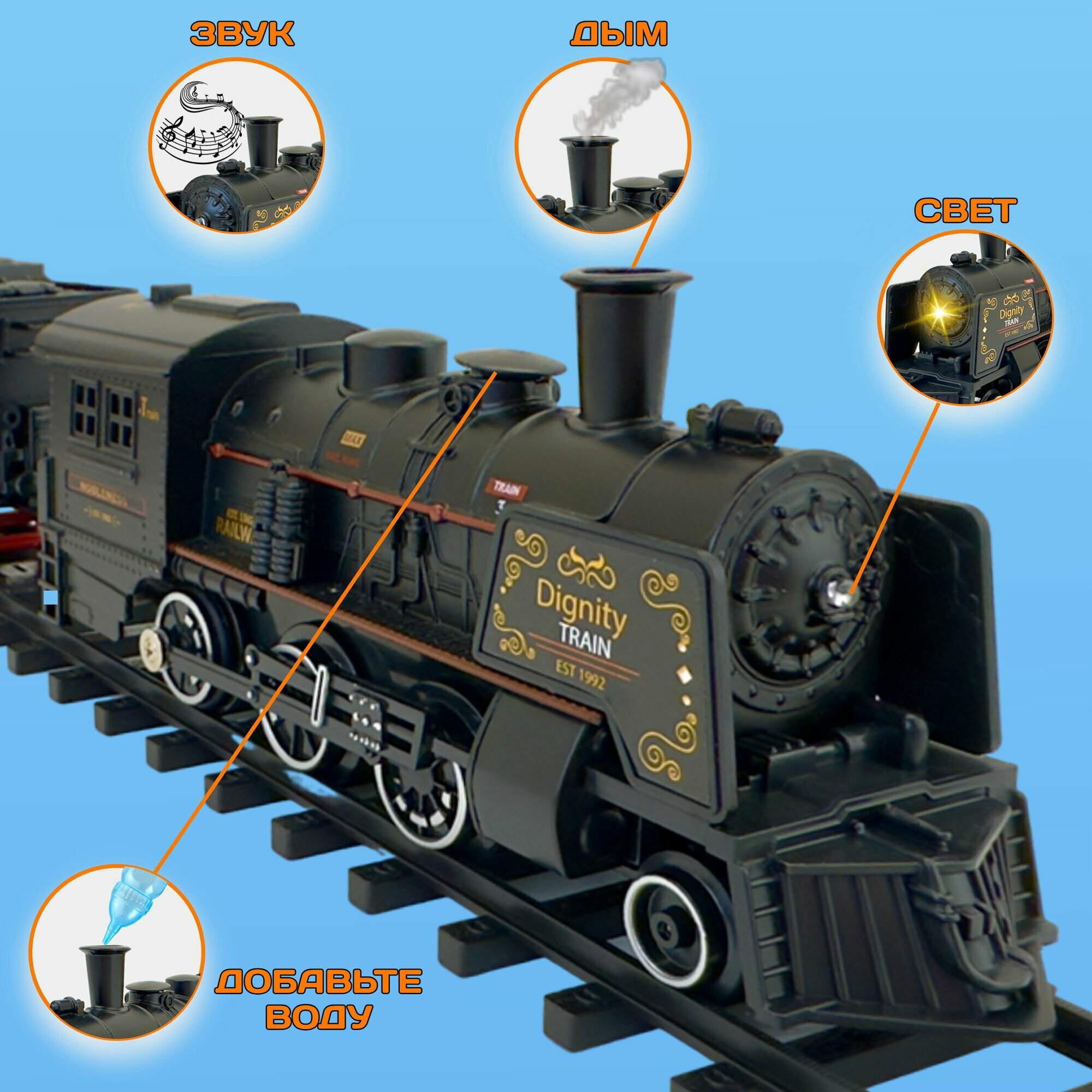 СохранитьДетская железная дорога с поездом Rail King, 16 элементов, размер дороги 103х78 см, металлический поезд, 3 вагона, дым, светящийся прожектор интересное: