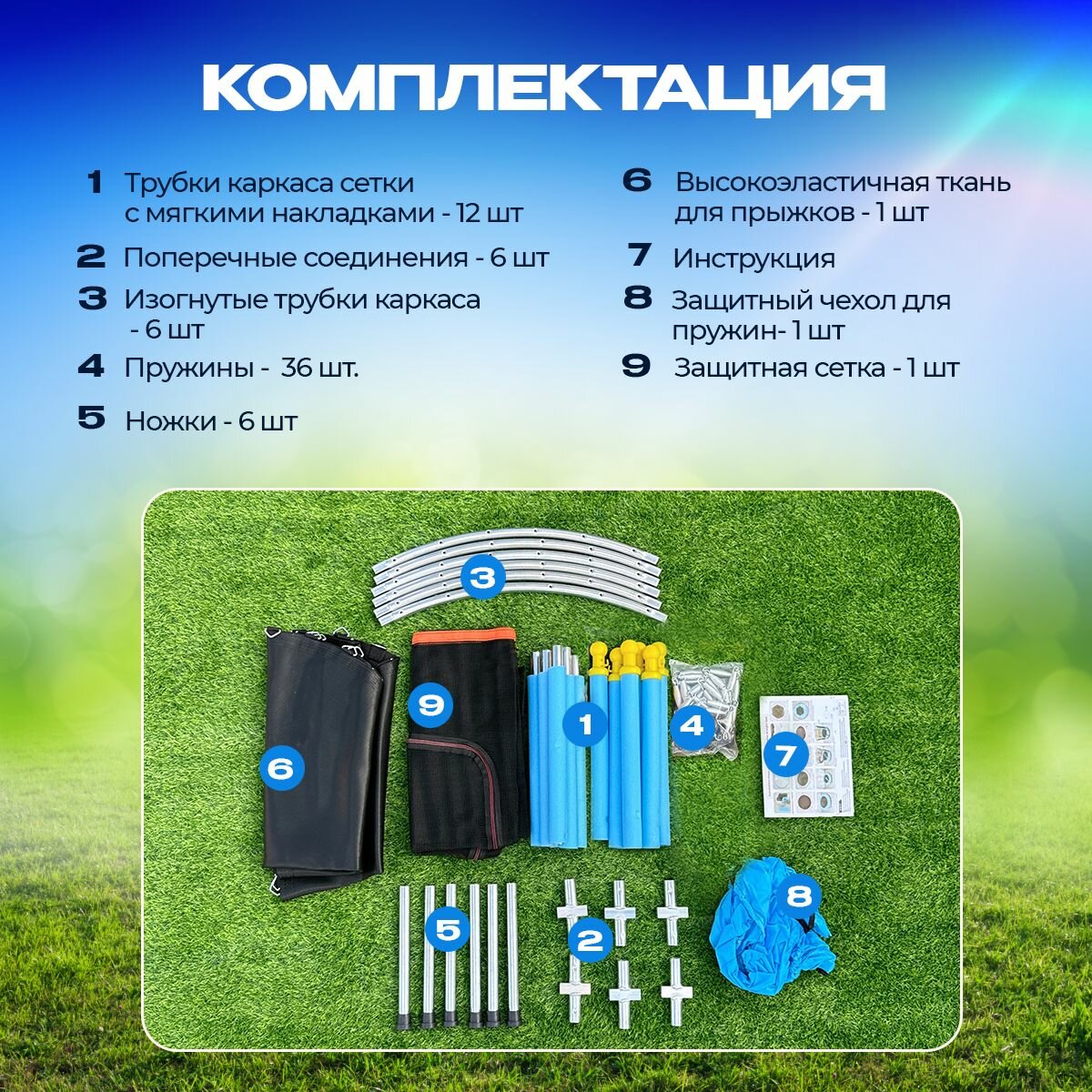 | Состав набора | 1) Трубки каркаса сетки с мягкими накладками - 12 шт 2) Поперечные соединения - 6 шт 3) Изогнутые трубки каркаса - 6 шт 4) Пружины - 36 шт 5) Ножки - 6 шт 6) Высокоэластичная ткань для прыжков - 1 шт 7) Защитный чехол для пружин - 1 шт 8) Защитная сетка - 1 шт 9) Инструкция |