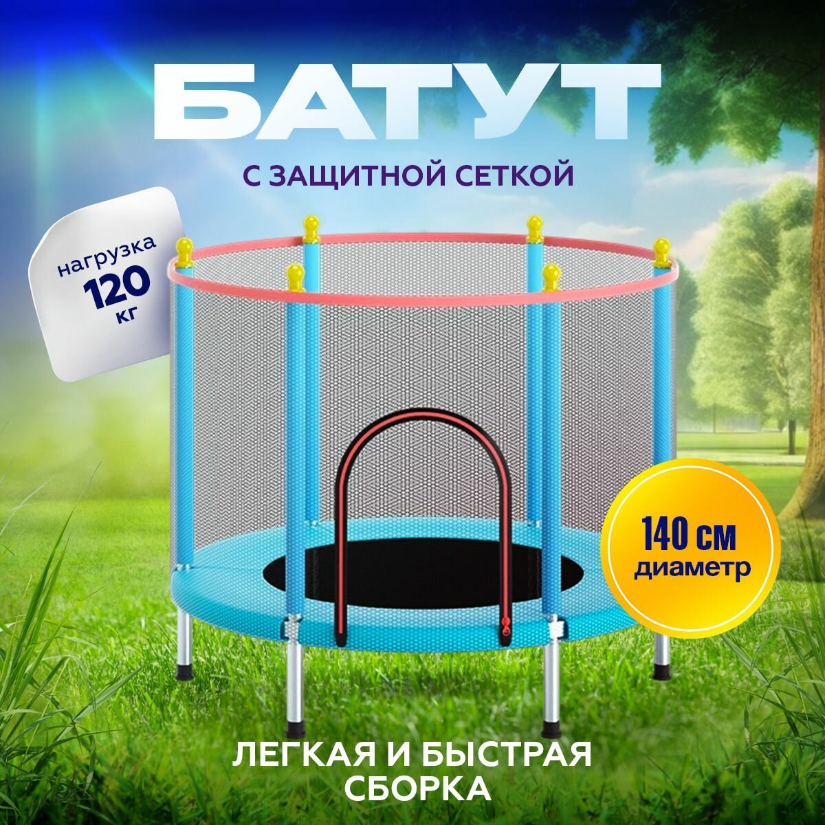 Батут с защитной сеткой детский и для взрослых каркасный уличный для джампинга и дома дачи спортивный манеж для малышей мини 140 см синий интересное: