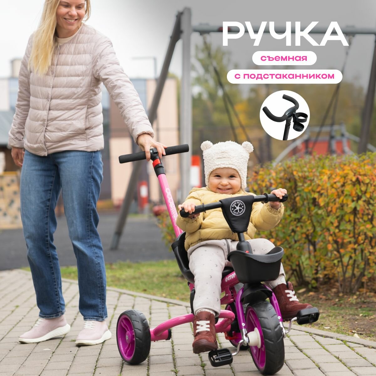 | Комплектация | Трёхколёсный складной велосипед OCTOPUS с Телескопической Родительской Ручкой, Подстаканником, Корзинкой, Подставкой для ног |