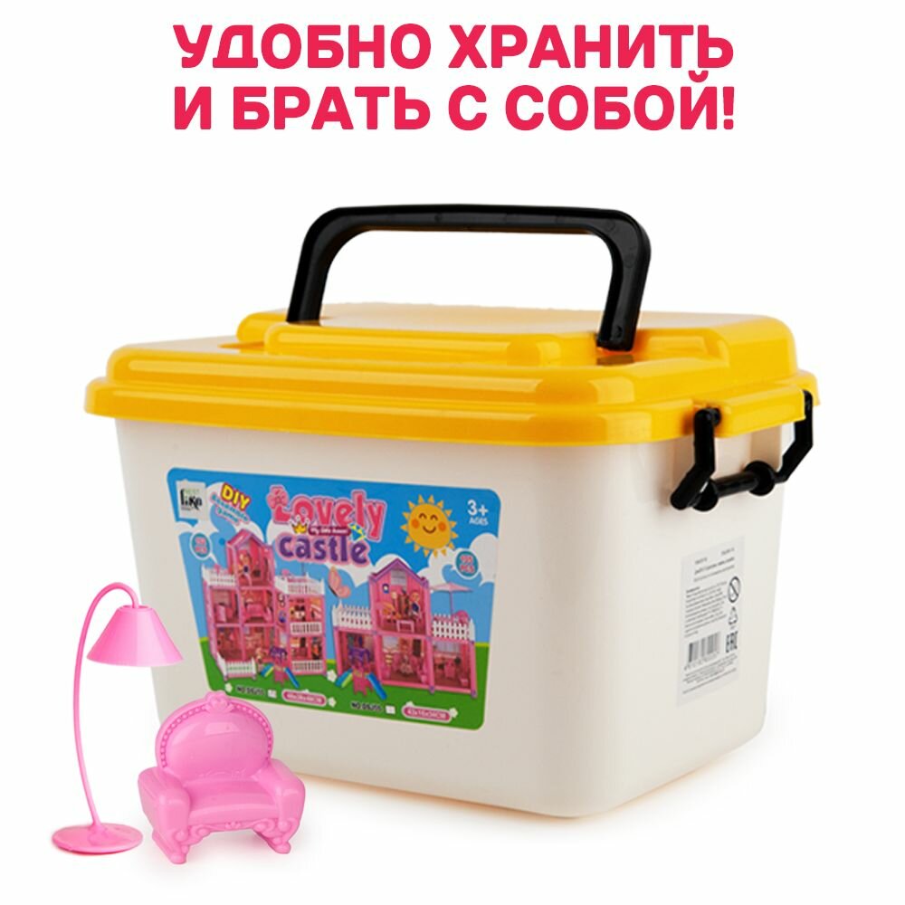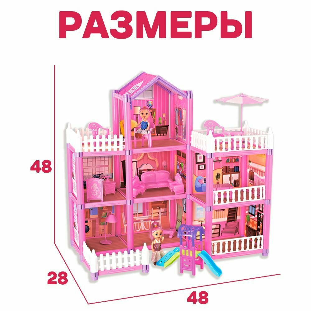 | Подробная комплектация | кукольный дом, кукла 2шт, стол 3шт, стул 3шт, горка маленькая, диван, кресло 2шт, тумба, зонтик, лампа напольная, баннер |