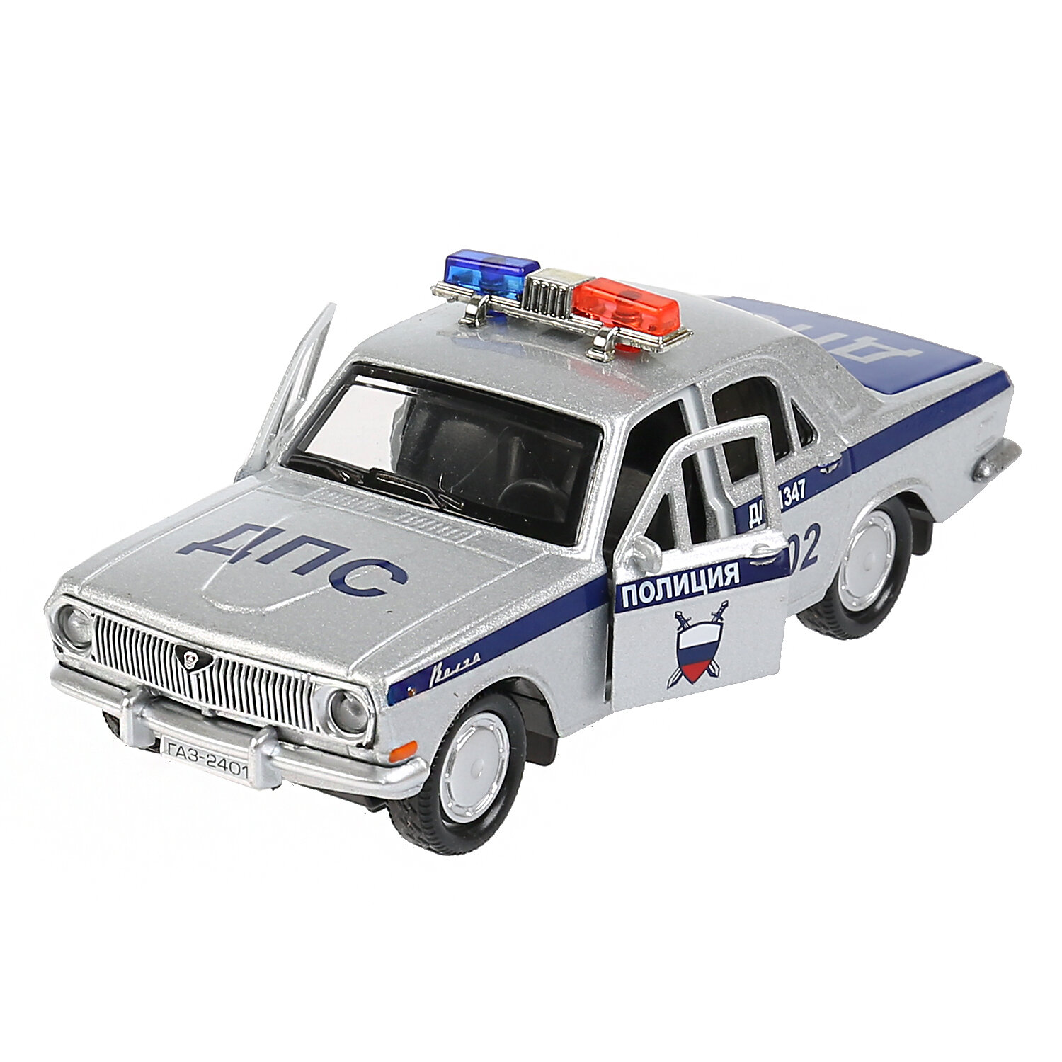 Машинка детская Полиция ГАЗ-2401 Волга 12 см, Технопарк, серебристая, металлический корпус, открываются двери и багажник