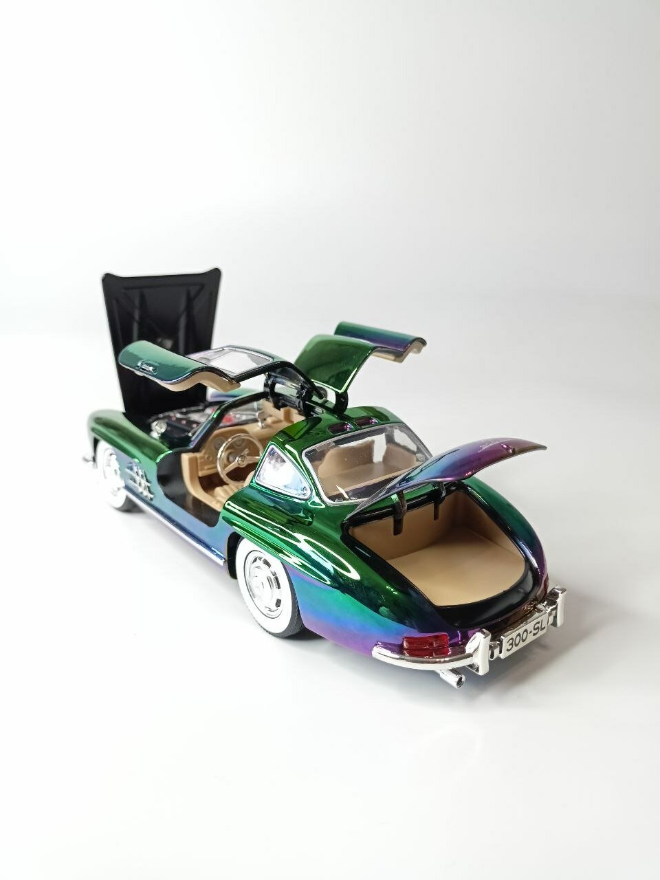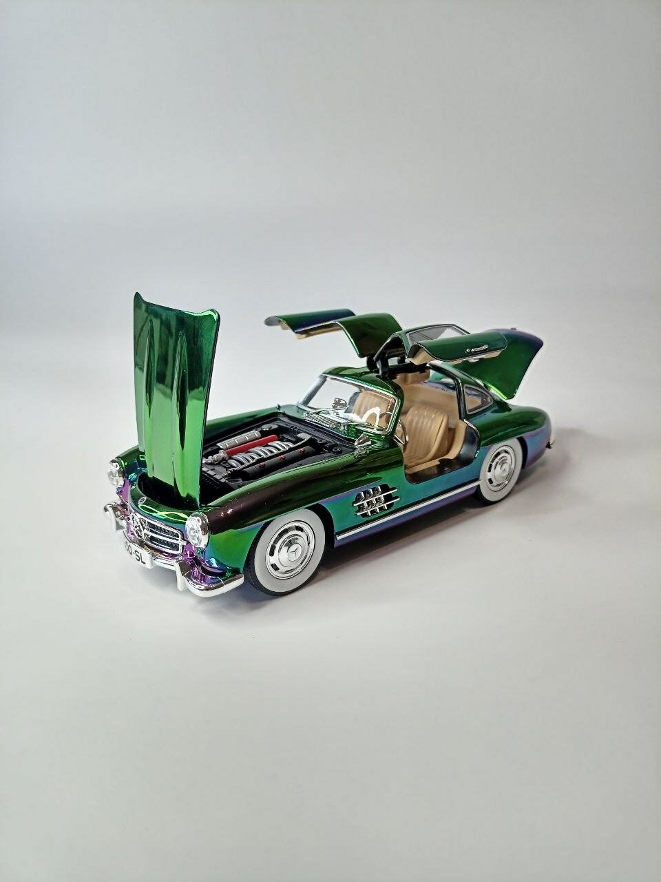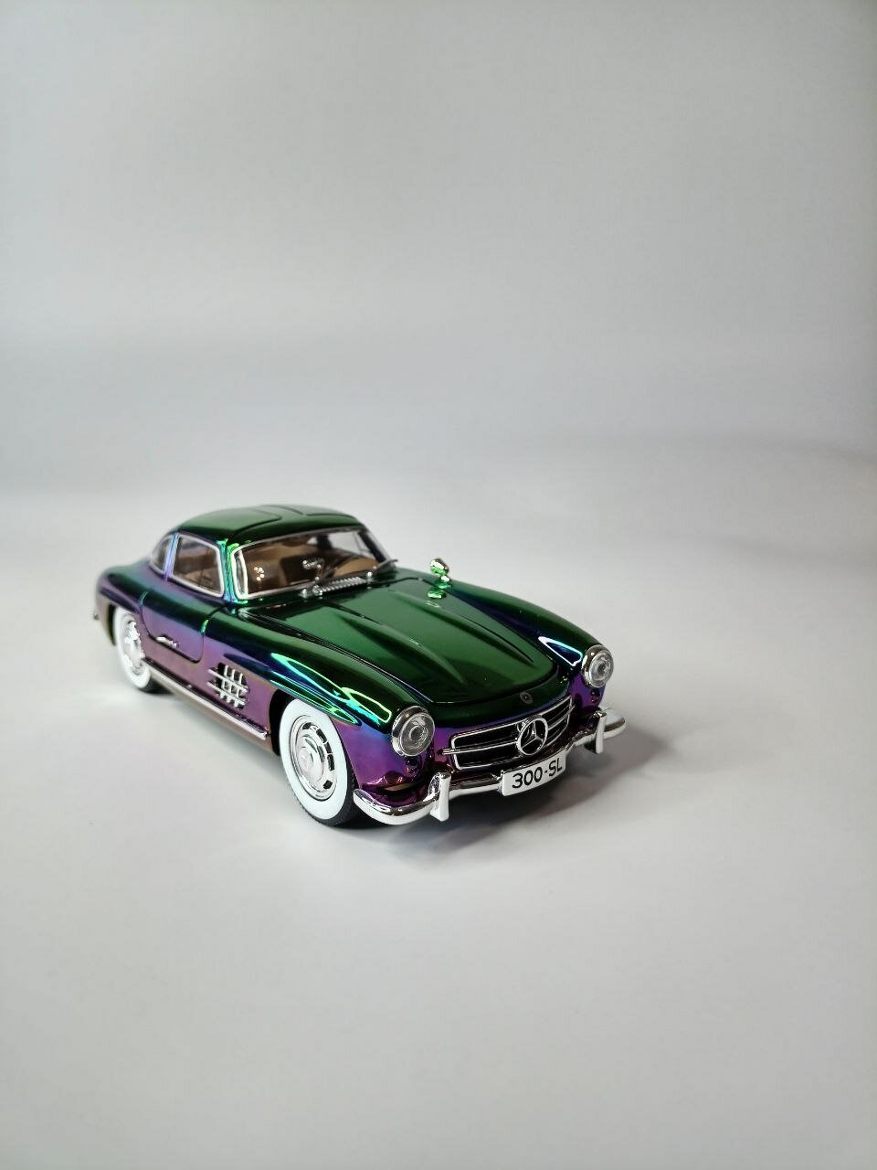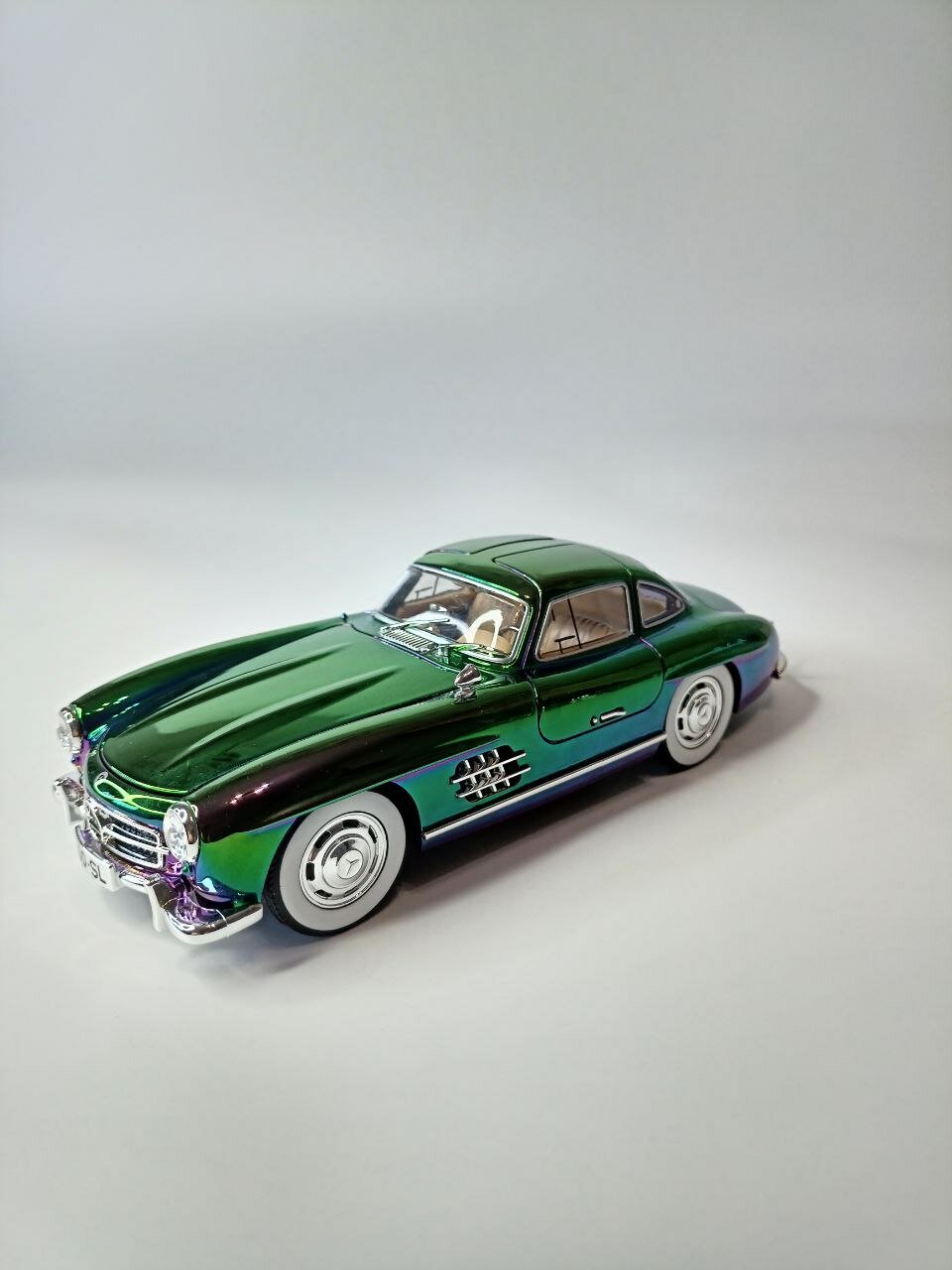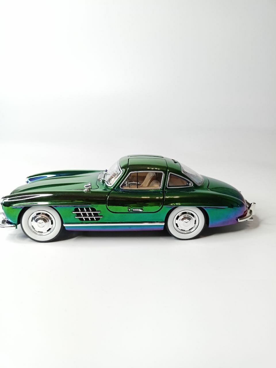 СохранитьМодель автомобиля Мерседес 300 SL ретро-коллекционная металлическая игрушка масштаб 1:24 зеленый перламутровый хамелеон интересное: