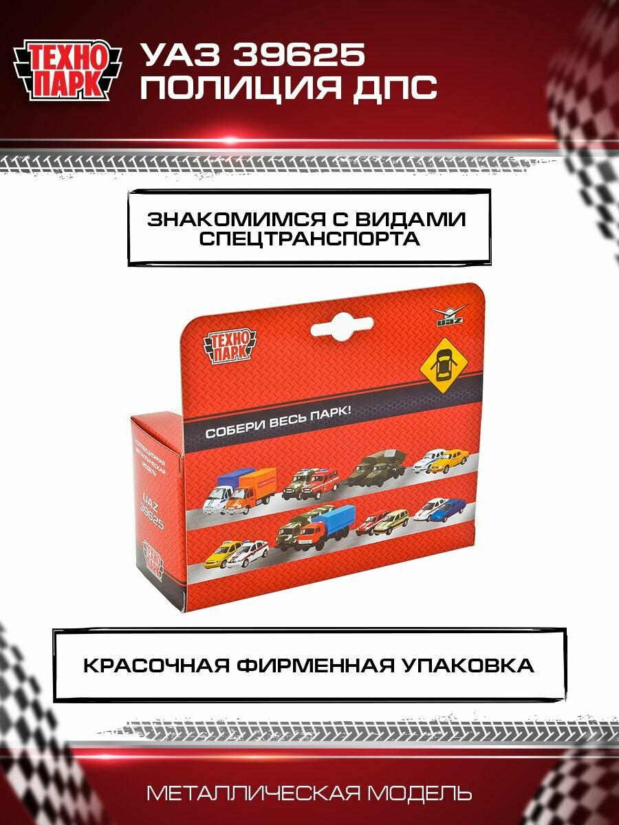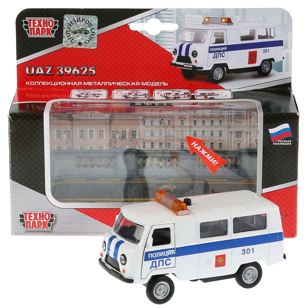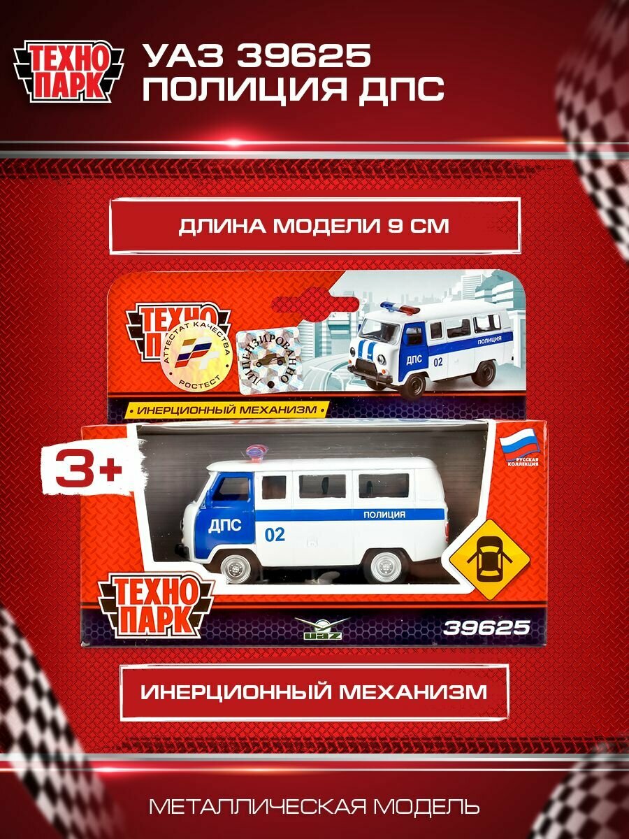 | Дополнительная информация | Машинка игрушка детская для мальчика УАЗ 39625 Полиция ДПС Технопарк детская модель металлическая коллекционная инерционная |