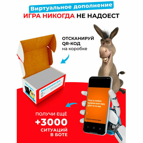 | Комплектация | 200 карточек с фото мемами; 100 двухсторонних карточек с 400 ситуациями; Коробка мемов, игровой набор - 1 шт |