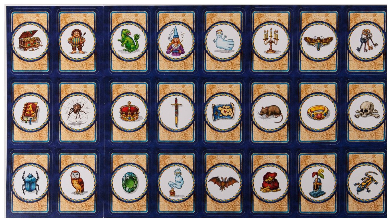| Комплектация | игровое поле, 34 карточки с изображением ходов лабиринта (карточки проходов), 24 карточки с сокровищами (секретные карточки), 4 игровые фигуры (ведьма, чародей, принцесса, ученик чародея) |