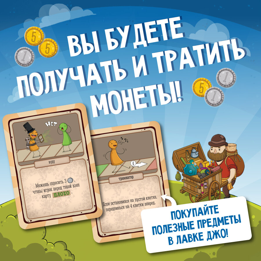 | Комплектация | игровое поле, 59 карт, 90 жетонов монет, 5 персонажей, 5 подставок под персонажей, 2 кубика, свод законов |