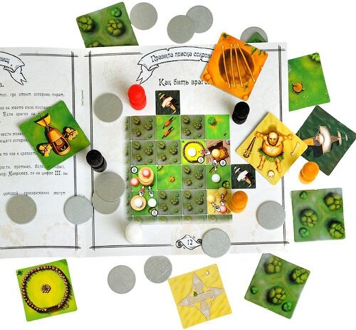 | Комплектация | 117 фишек игрового поля. Как уже описывалось, именно из них собирается остров, на котором вскоре произойдут нешуточные баталии. 4 корабля, на которых прибыли пираты и конкистадоры. 12 деревянных фишек: четыре команды, решившие высадиться на остров в поисках пиастров. 37 пластиковых монет, которые используются как маркеры сокровища. Правила игры |