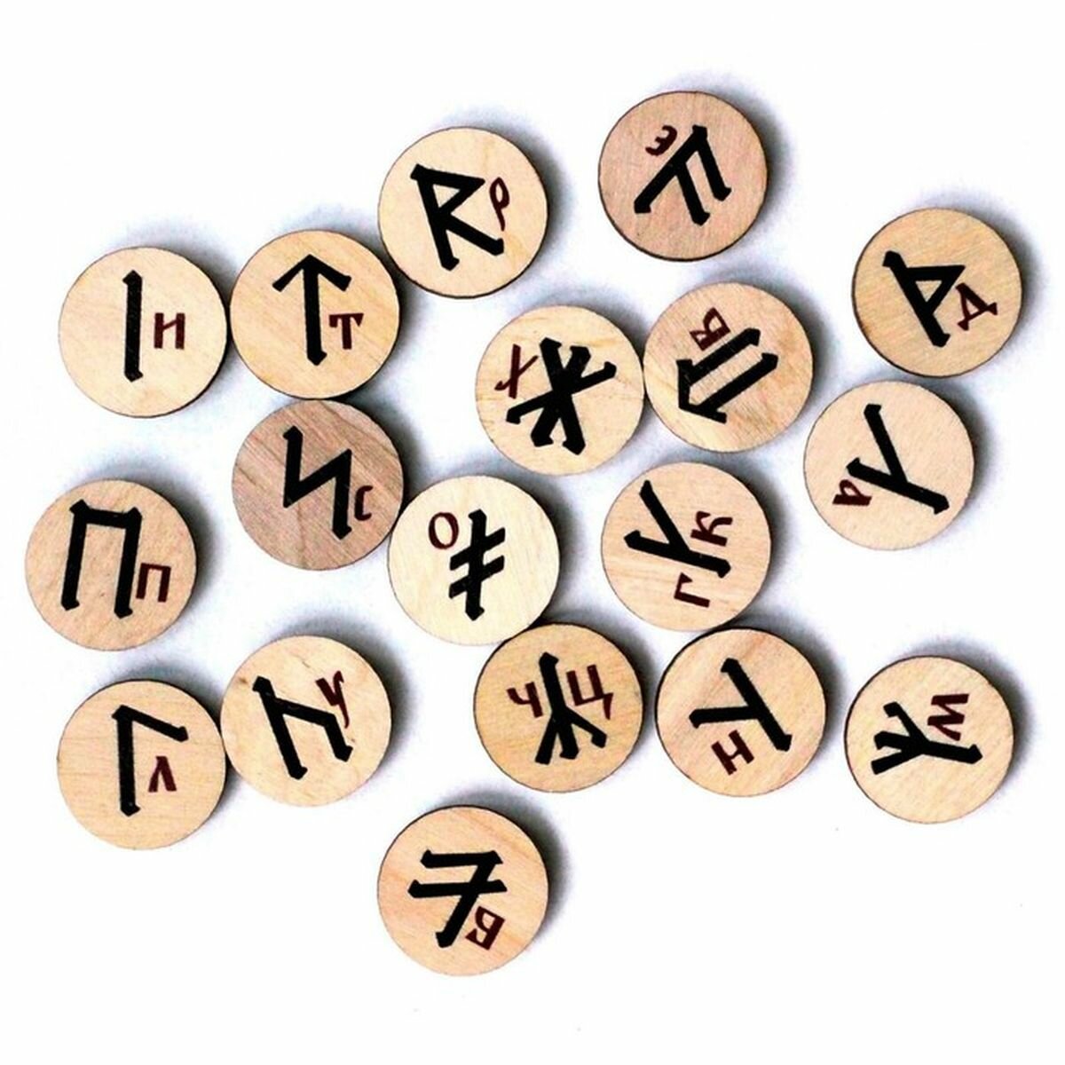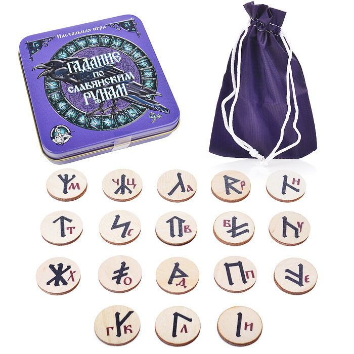 | Комплектация | руны – 18 шт. (диаметр – 2,5 см), мешочек из ткани – 1 шт. (17,5 х 12 см), правила игры |