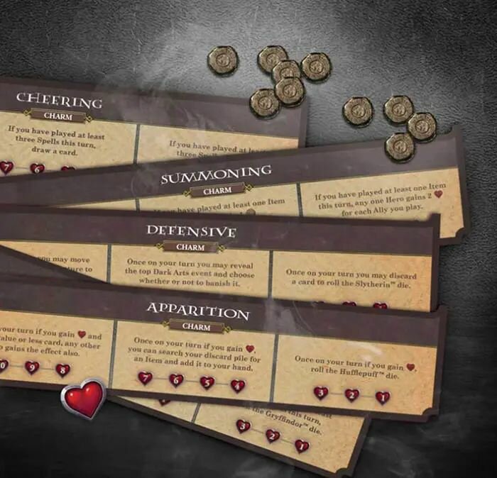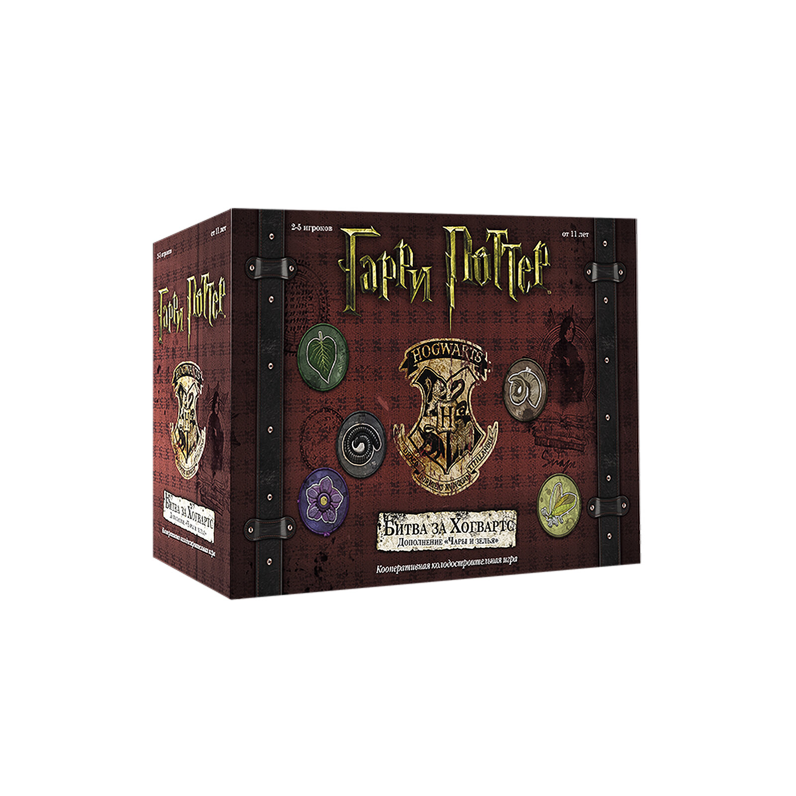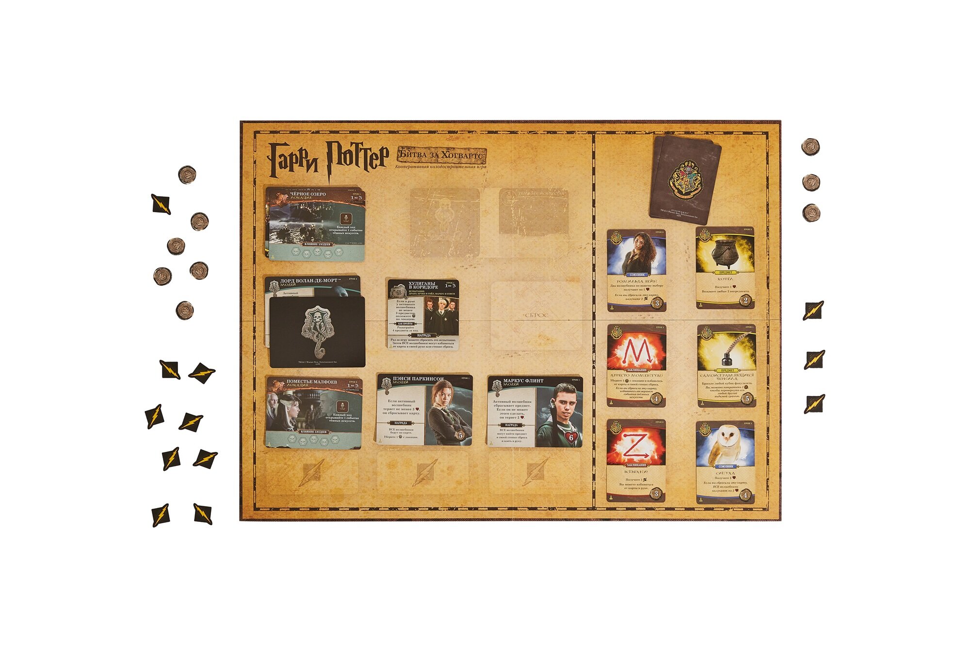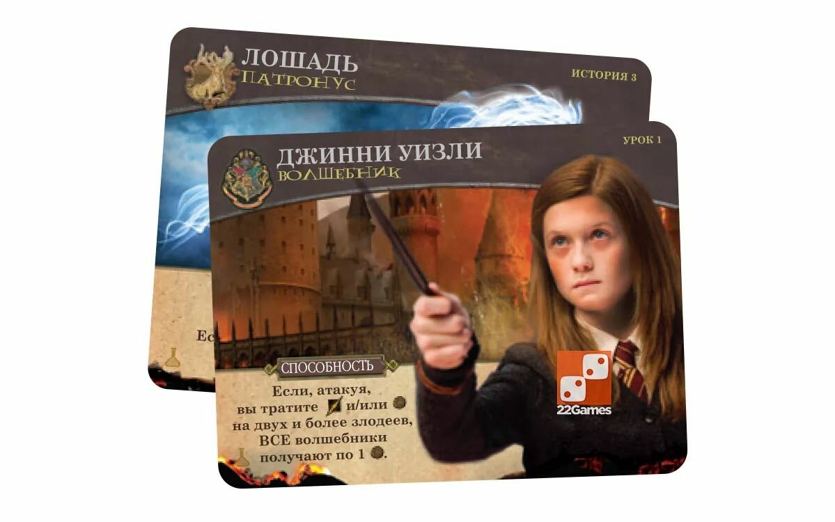 | Дополнительная информация | В начале игры каждый участник выбирает себе одного из персонажей, за которого он будет играть: Гарри, Гермиона, Рон или Невилл. В течение игры герои будут противостоять темным силам, отражая атаки приспешников Темного Лорда. У каждого персонажа в стартовой колоде помимо семи стандартных заклинаний есть три уникальных карты, поэтому стили игры участников могут несколько отличаться. Всего в наборе семь коробок с картами и правилами, по числу книг Д. Роулинг. Коробки открываются по ходу игры, следуя сюжету книг. Каждый новый набор вводит новые карты, заклинания, полезные артефакты, союзников, карты героев заменяются на карты с ними же, но уже повзрослевшими, раскрывая дополнительные возможности. Но самое главное – каждый раз появляются все новые злодеи с особыми свойствами. Таким образом, сложность и длительность партий будет увеличиваться с каждой новой коробкой. |