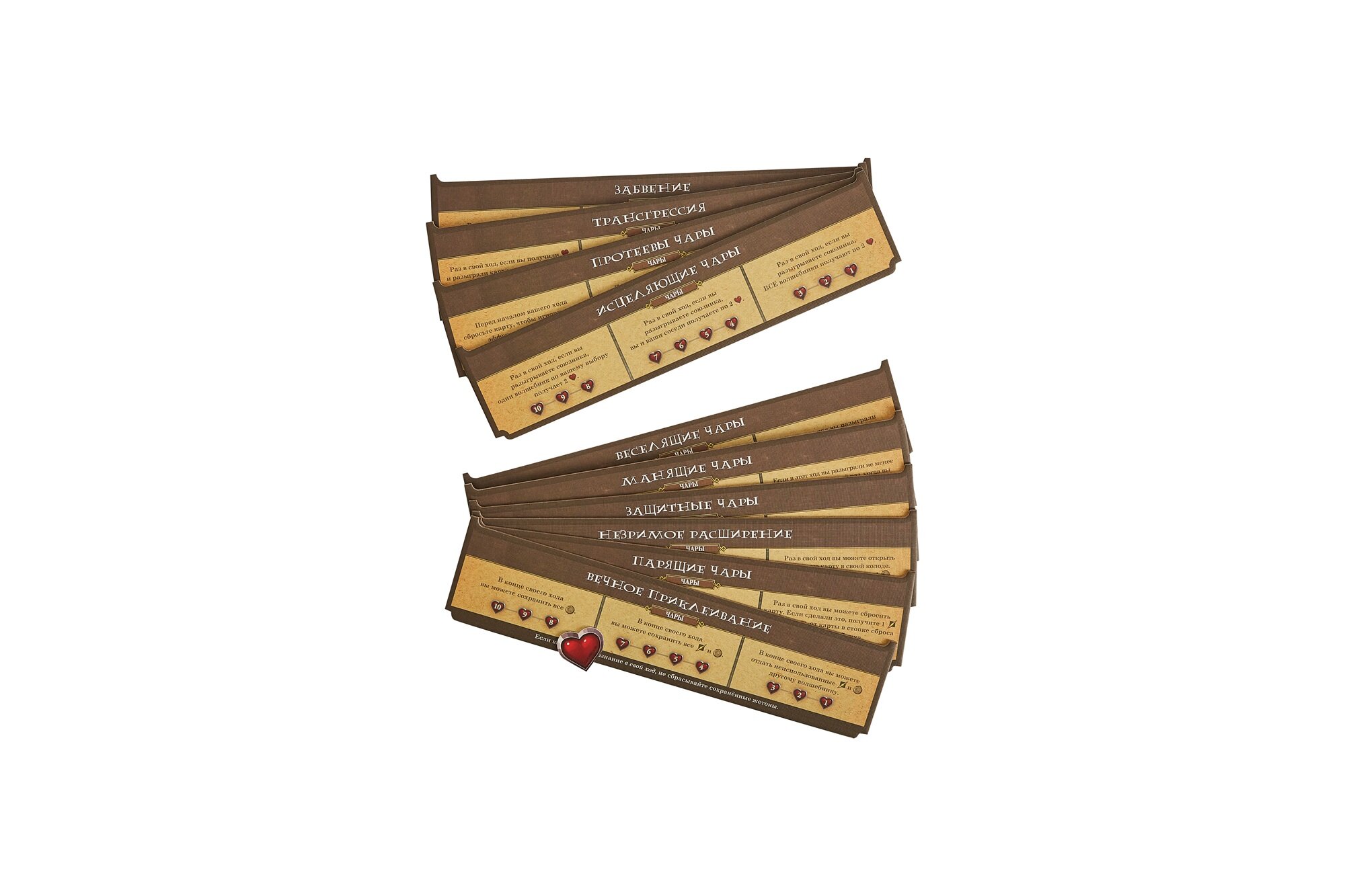 | Комплектация | 252 карты (47 маленьких, 142 обычных, 63 больших); 4 кубика; 7 коробок с заданиями; правила для 6 заданий; 4 планшета волшебников; 8 металлических жетонов влияния злодеев; 70 жетонов маркеров (35 атаки, 25 влияния, 4 здоровья, 2 защиты, 4 дополнительных жетона); правила игры на русском языке. |