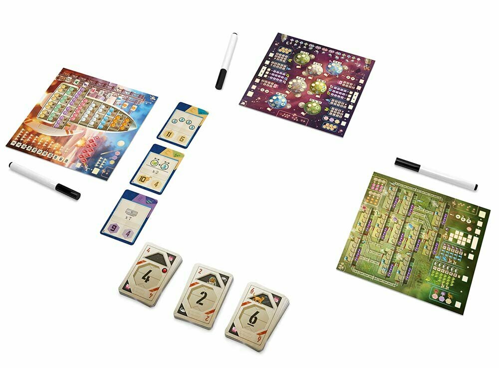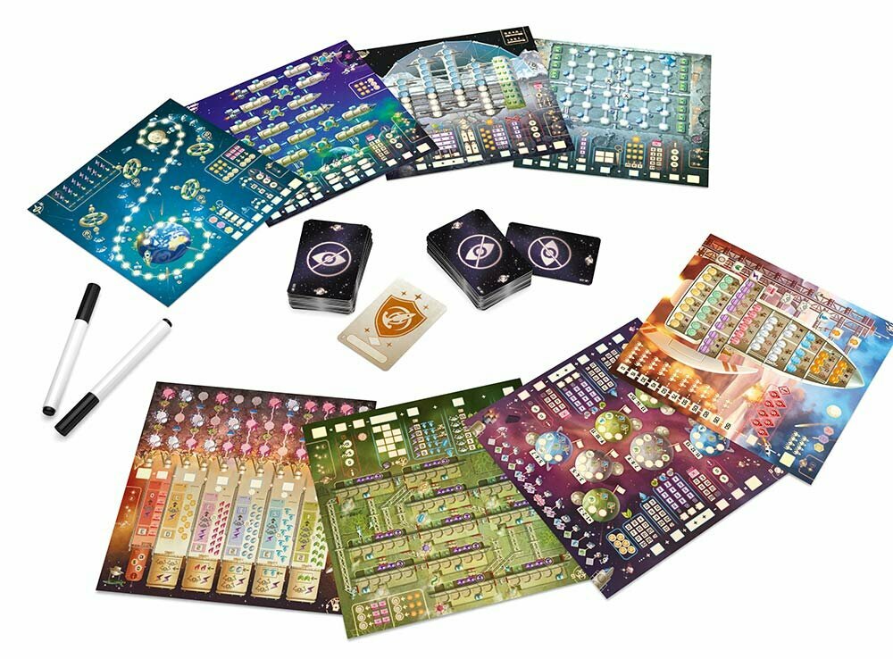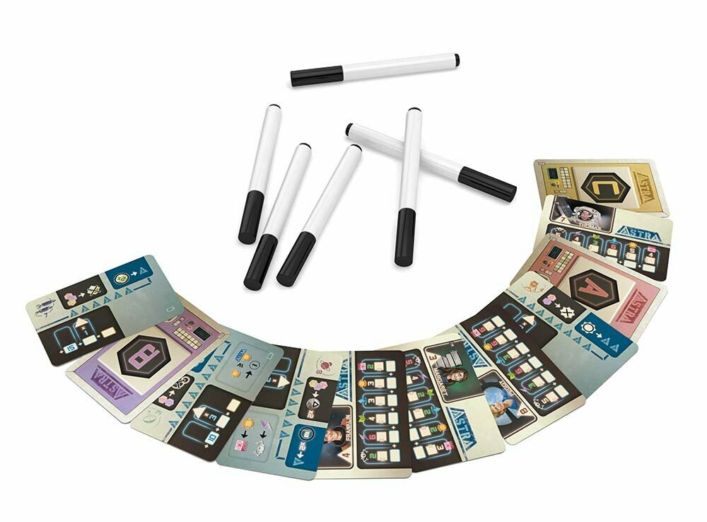| Комплектация | 63 карты звездолётов; 48 карт миссий; 6 стирающихся маркеров;11 карт для соло-режима ASTRA; 1 карта капитана с маркерной поверхностью для приключения № 8 и режима кампании; 24 двусторонних игровых поля с маркерной поверхностью: 6 наборов из 4 полей с разными приключениями на каждой стороне (приключения пронумерованы от 1 до 8); 97 карт для режима кампании. |