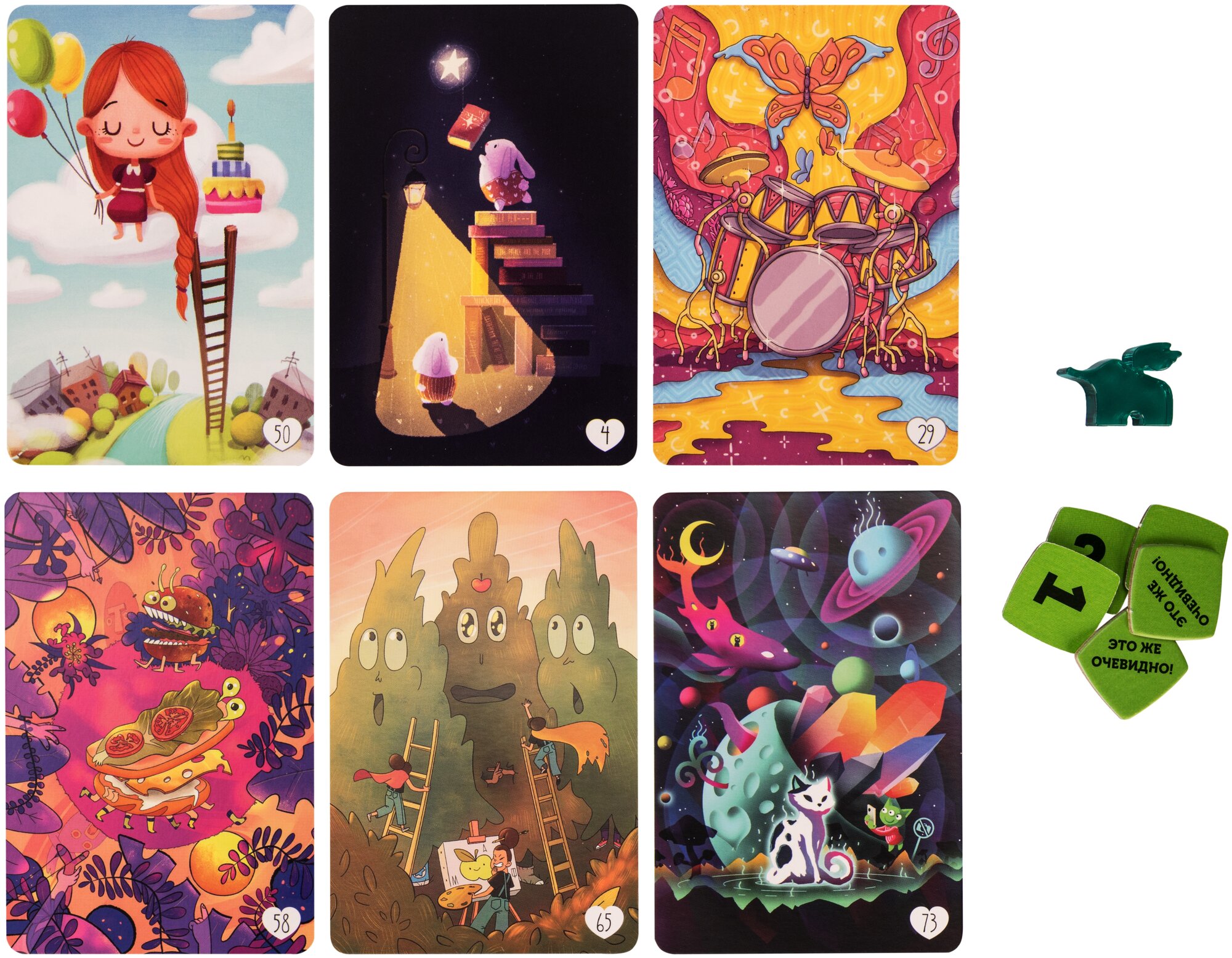 | Комплектация | игровое поле, 98 карт ассоциаций, 7 фишек слонов, 49 жетонов голосований, правила игры |