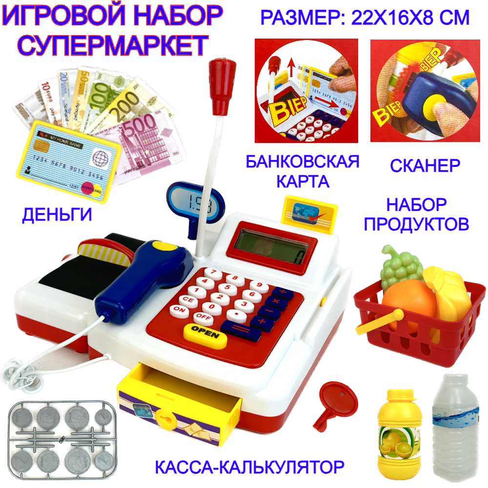 Игровой набор Супермаркет, касса, сканер, банковская карта, игрушечные деньги, набор продуктов, калькулятор, 22х16х8 см интересное: