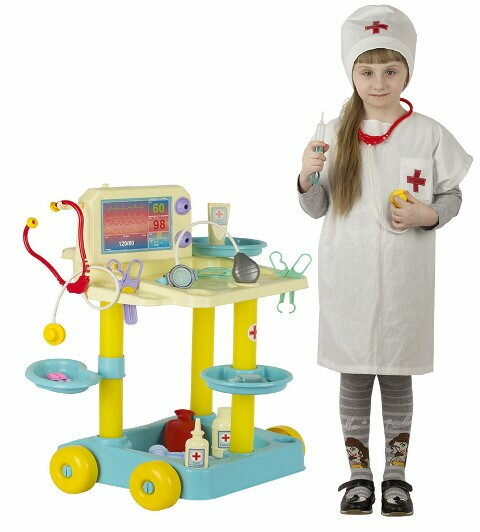 | Комплектация | - столик-тележка (50х40х56 см.) - кардиограф. - медицинские инструменты (17 шт.) - костюм доктора. • Материалы: пласти |