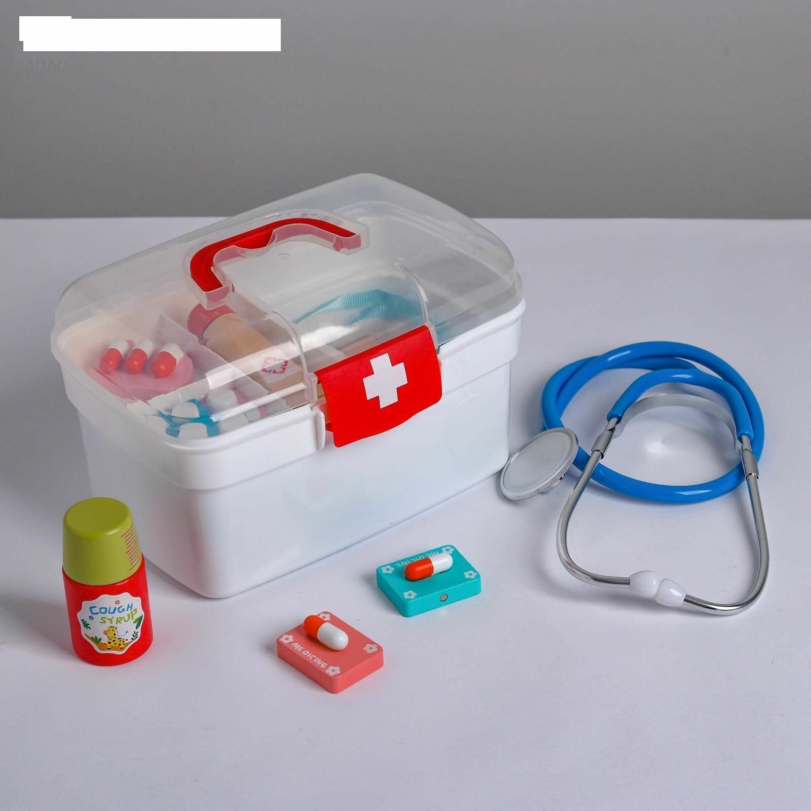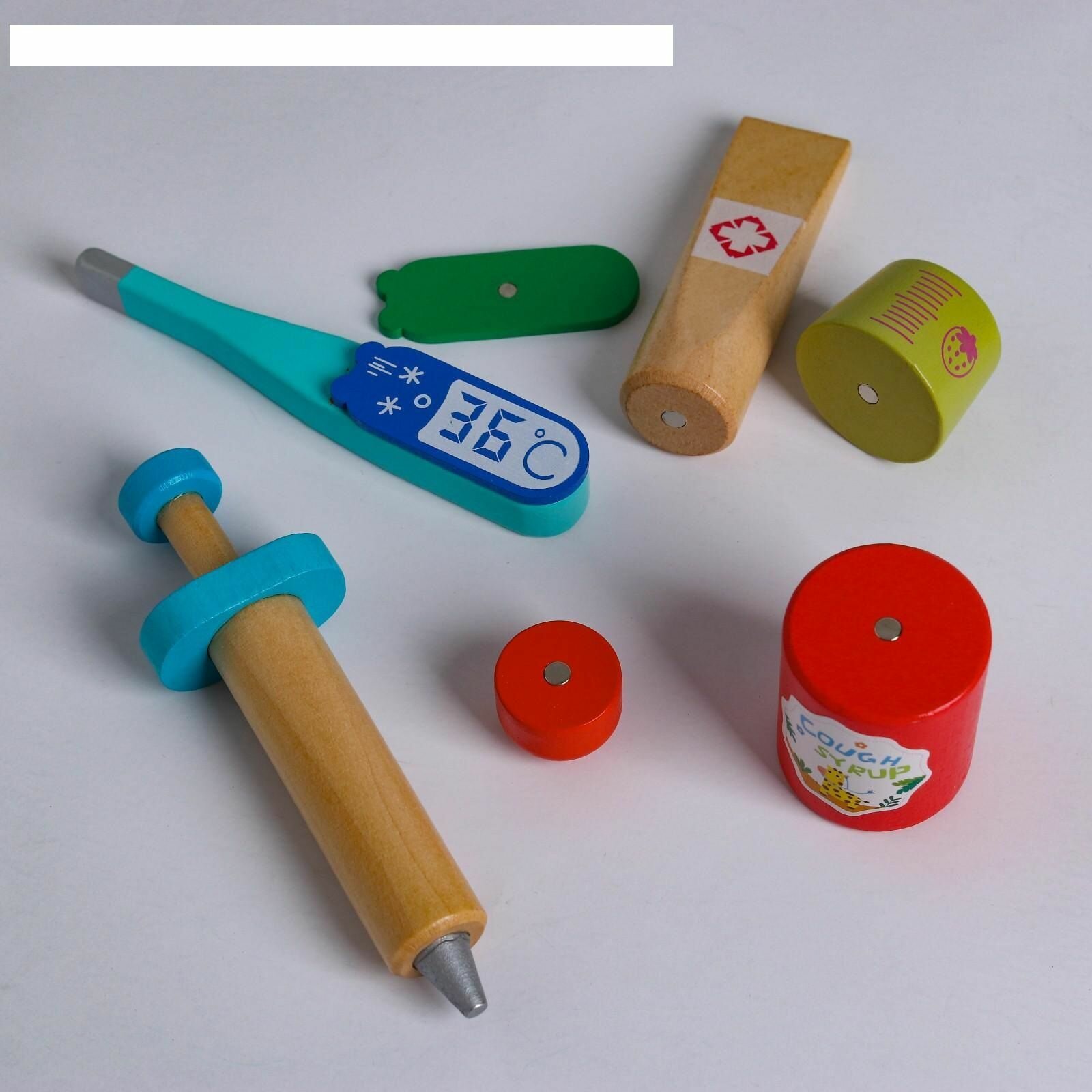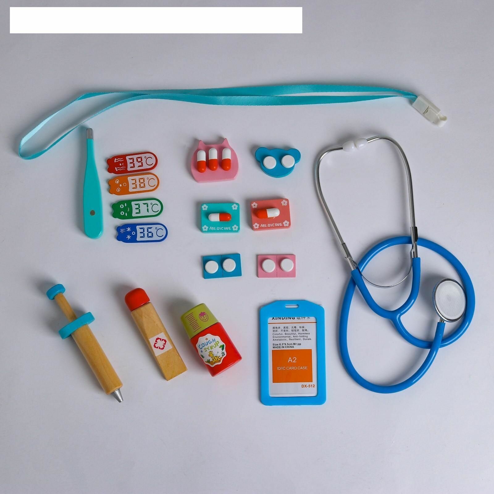 | Комплектация | термометр, 4 таблички с показателями температуры, шприц, бейдж со шнурком, стетоскоп, 6 таблеток, микстура от кашля, лечебная мазь |