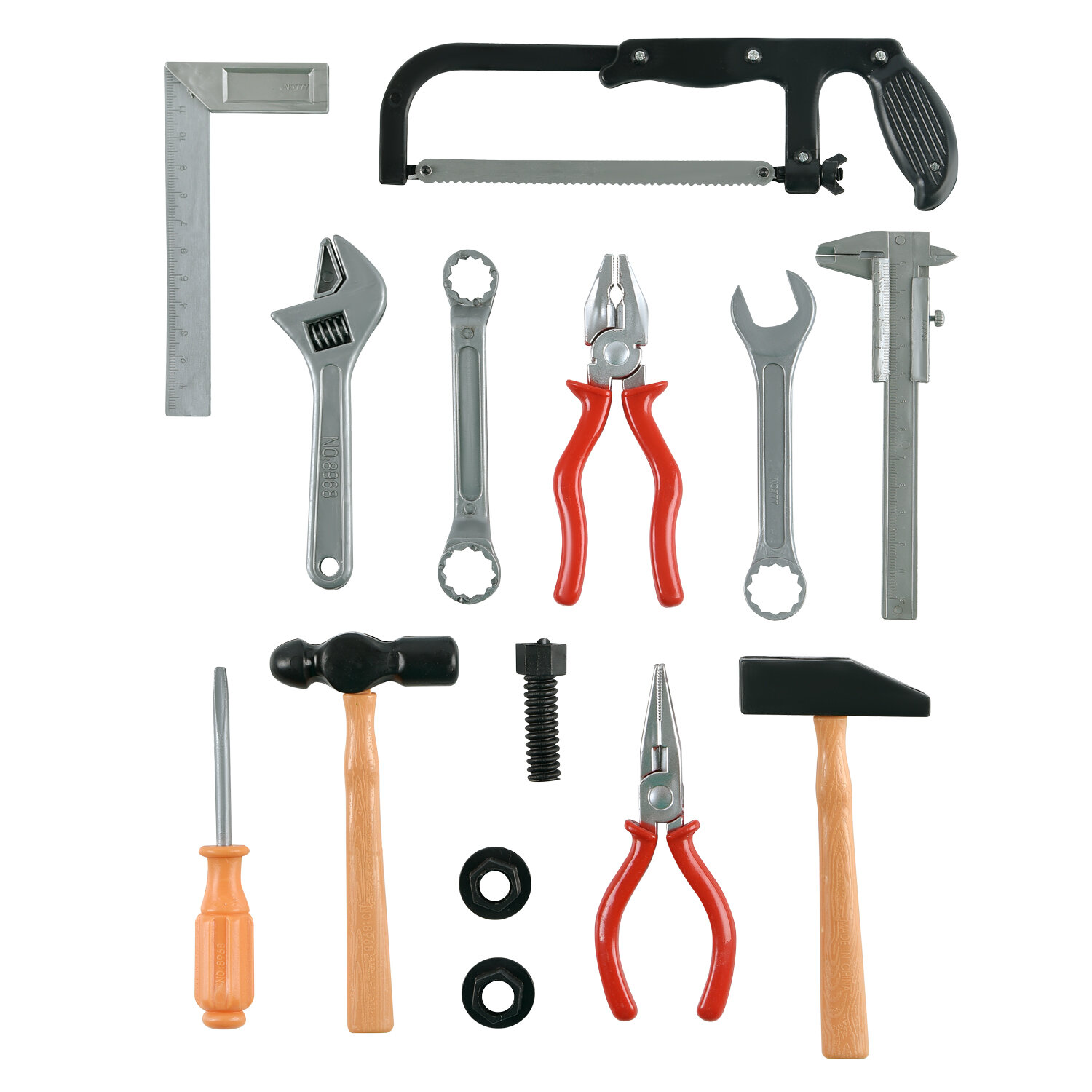 | Комплектация | набор из 14 предметов, ассортименте 2 вида. Комплектация 1: ножовка, штангенциркуль, молоток - 2 штуки, плоскогубцы, болт, гаечный ключ, угольник, отвертка, пассатижи, гайка - 2 штуки. Комплектация 2: топор, ножовка, клещи, пассатижи, молоток, канцелярский нож, гаечный ключ, отвертка, шестигранный ключ, газовый ключ, стамеска, болт, гайка |