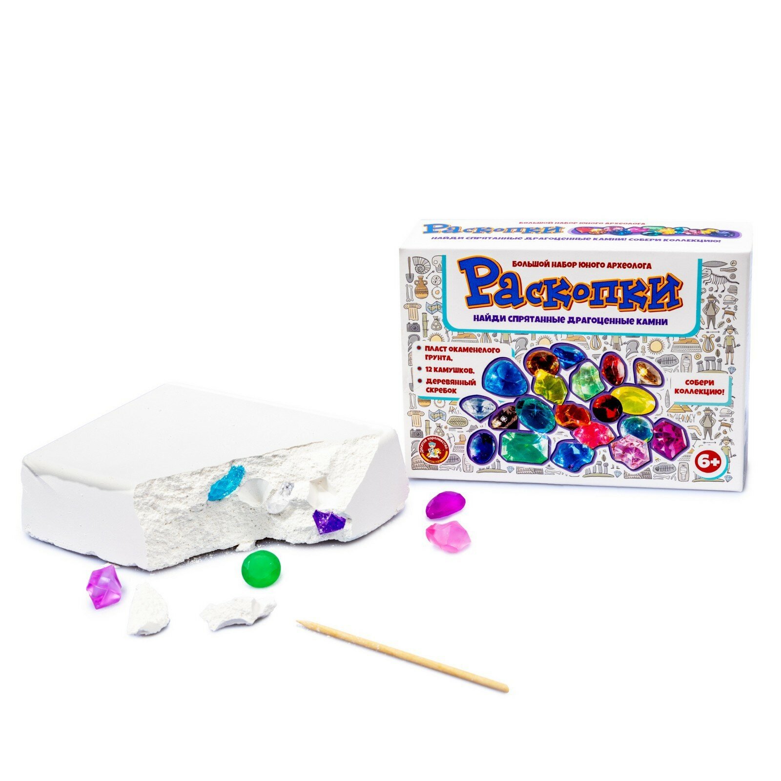 | Комплектация | пласт грунта (гипс), деревянный стек – 1 шт7, драгоценные камни из пластика - 12 шт. |