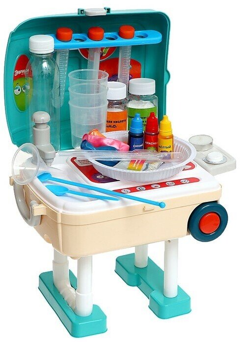 | Комплектация | лимонная кислота, гидрокарбонат натрия, цветные таблетки, краситель — 3 шт, таблетка (сухое горючее), тарелочка. пробирки — 3 шт, пипетки — 3 шт, шарики — 3 шт, ложечка — 1 шт, палочка для перемешивания — 1 шт, воронка — 1 шт, свеча — 1 шт, мерных стаканчика — 3 шт, бутылочка 250 мл, кран вода бежит (помпа), высота чемодана с ручкой 34 см |