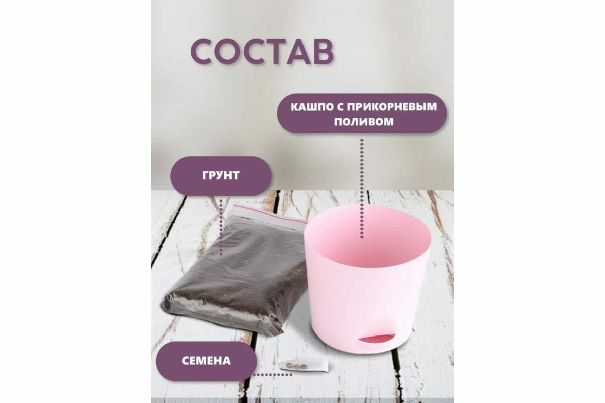 | Комплектация | пластиковый горшок объемом 0,4 литра с системой прикорневого полива, семена, плодородный грунт |