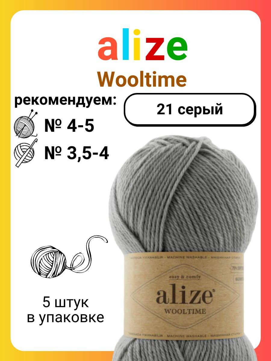 Пряжа Alize Wooltime серый (21), 75%шерсть/25%полиамид, 200м, 100г, 5шт