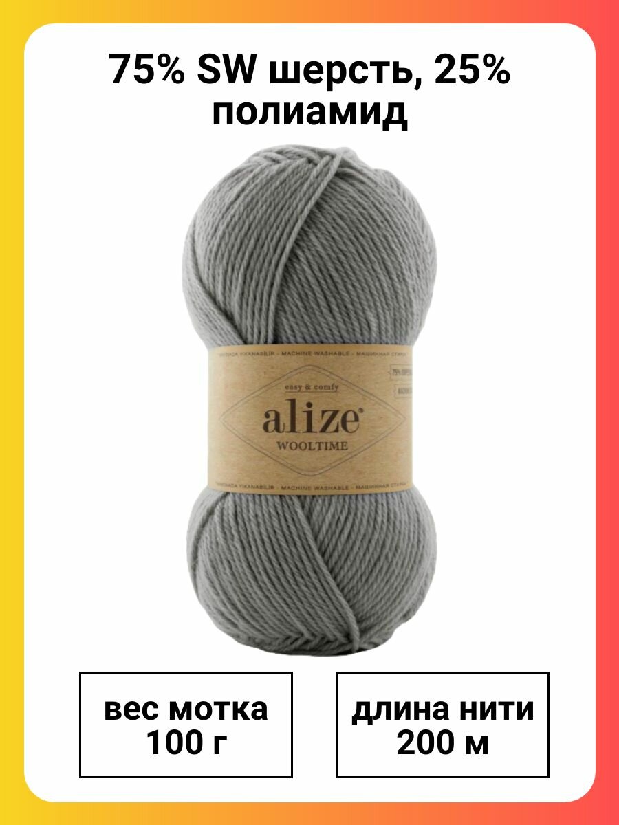 Пряжа Alize Wooltime серый (21), 75%шерсть/25%полиамид, 200м, 100г, 1шт