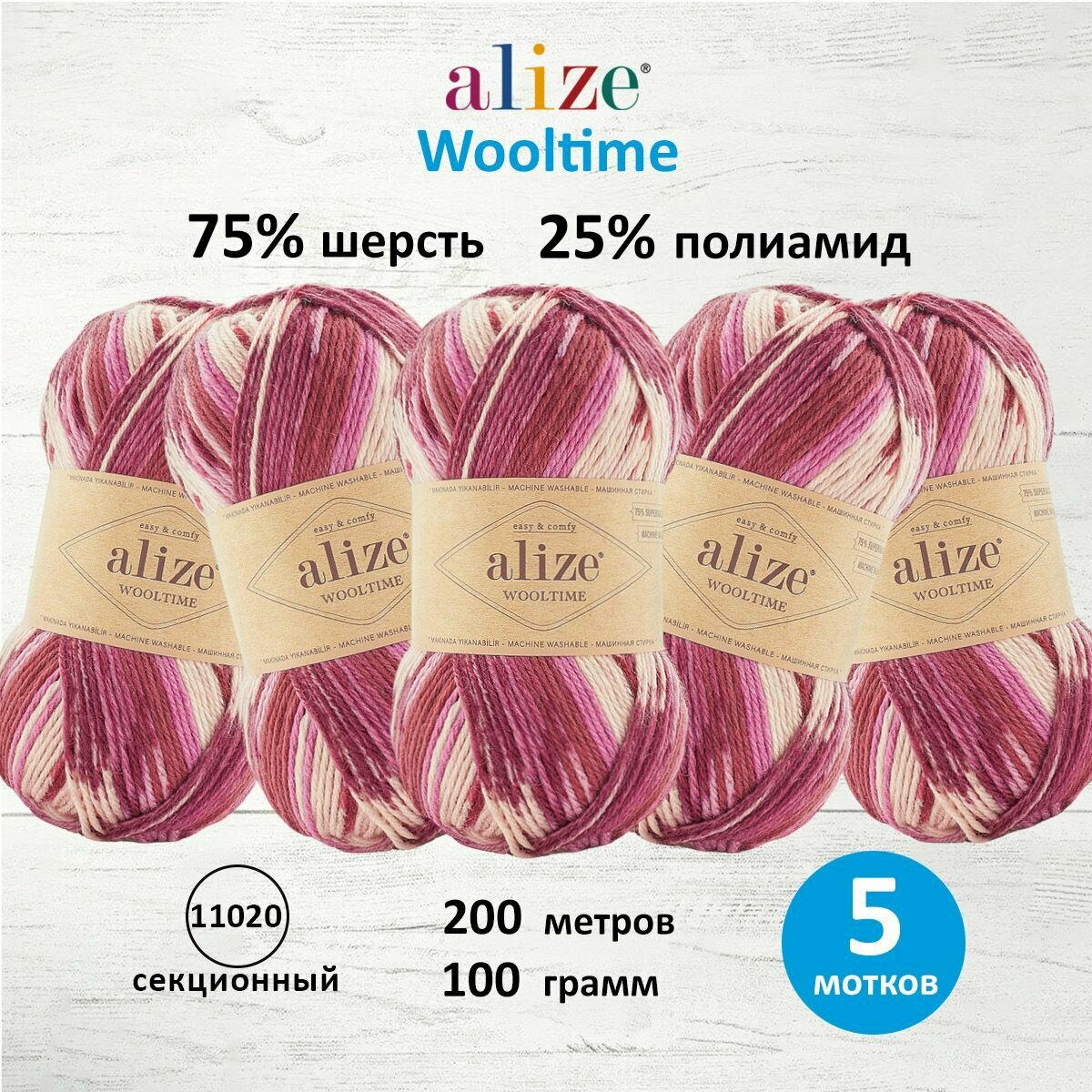 Пряжа ALIZE "Wooltime", 100 гр, 200 м, 75% SW шерсть, 25% полиамид, 11023 секционный, 5 шт
