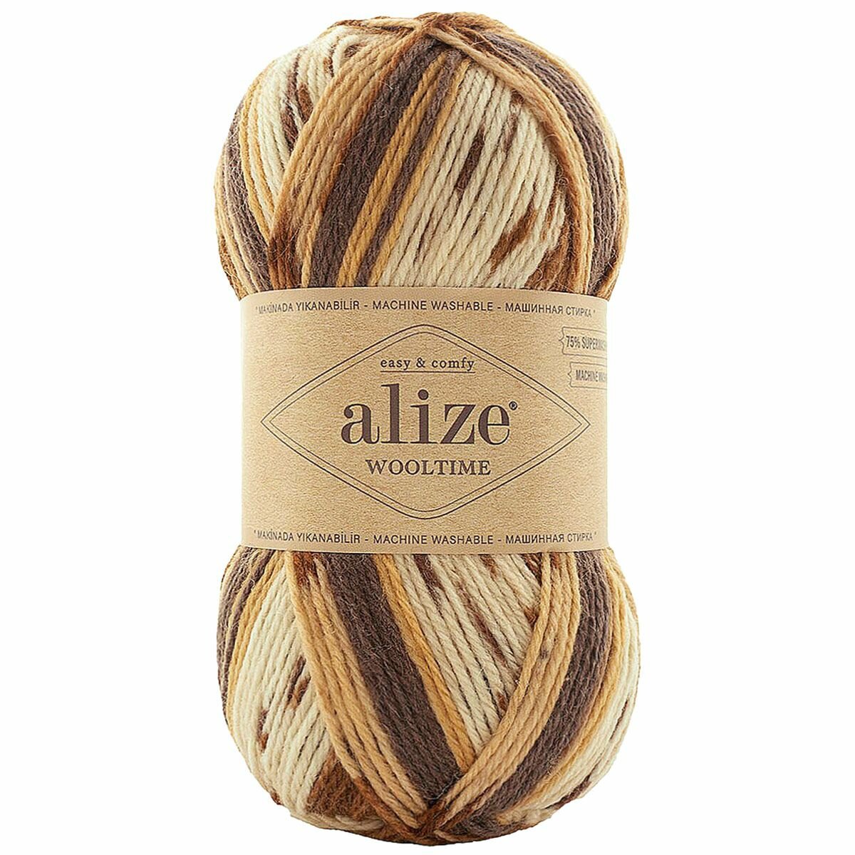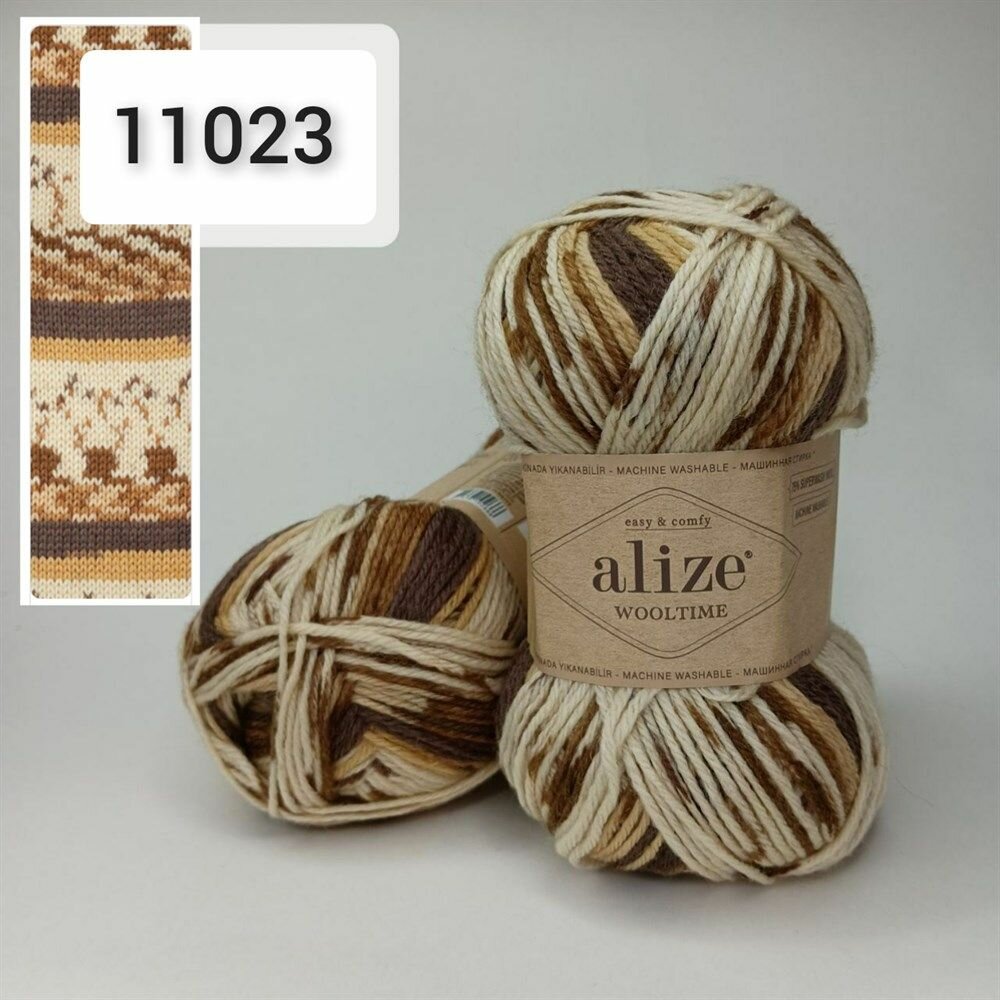Пряжа Wooltime, Alize, бел/беж/корич - 11023, 75% SW шерсть, 25% полиамид, 5 мотков, 100 г., 200 м.