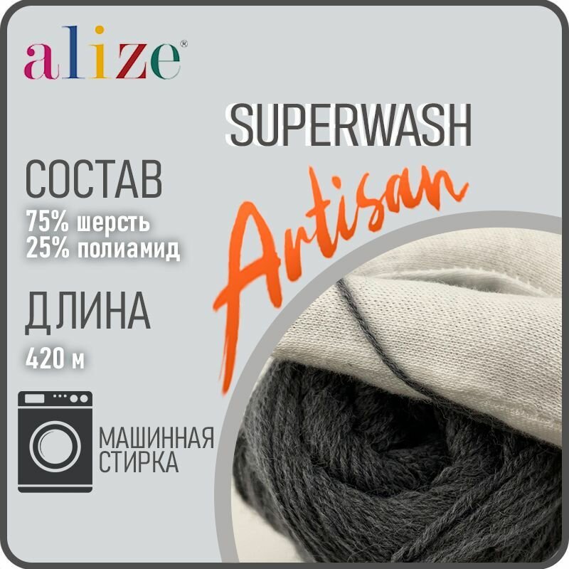 Пряжа Alize Superwash Artisan (Ализе Супервош Артизан) - 1 моток, Серый (836), 75% шерсть супервош, 25% полиамид, 420м/100г
