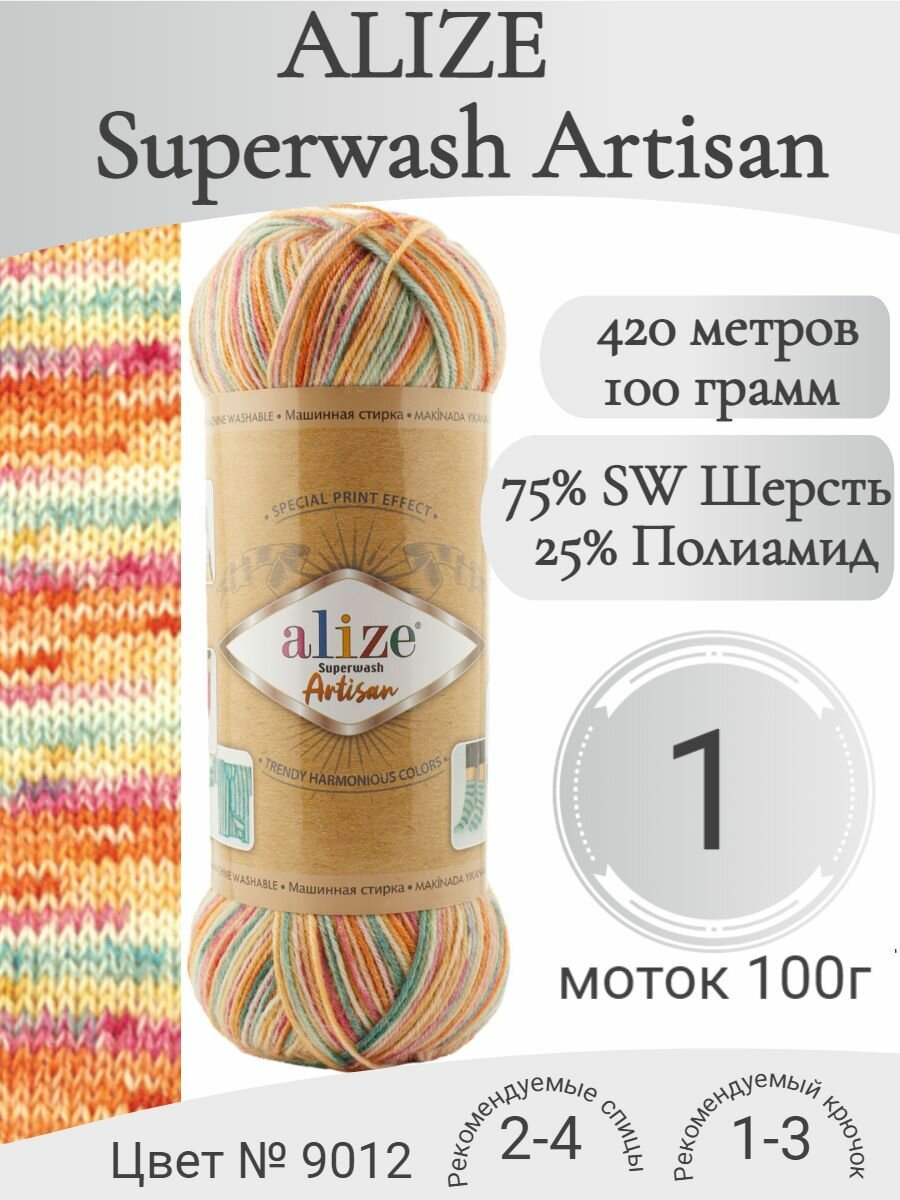 Пряжа Alize Superwash Artisan (Ализе Супервош Артизан) - 2 мотка, Мармелад (433), 75% шерсть супервош, 25% полиамид, 420м/100г