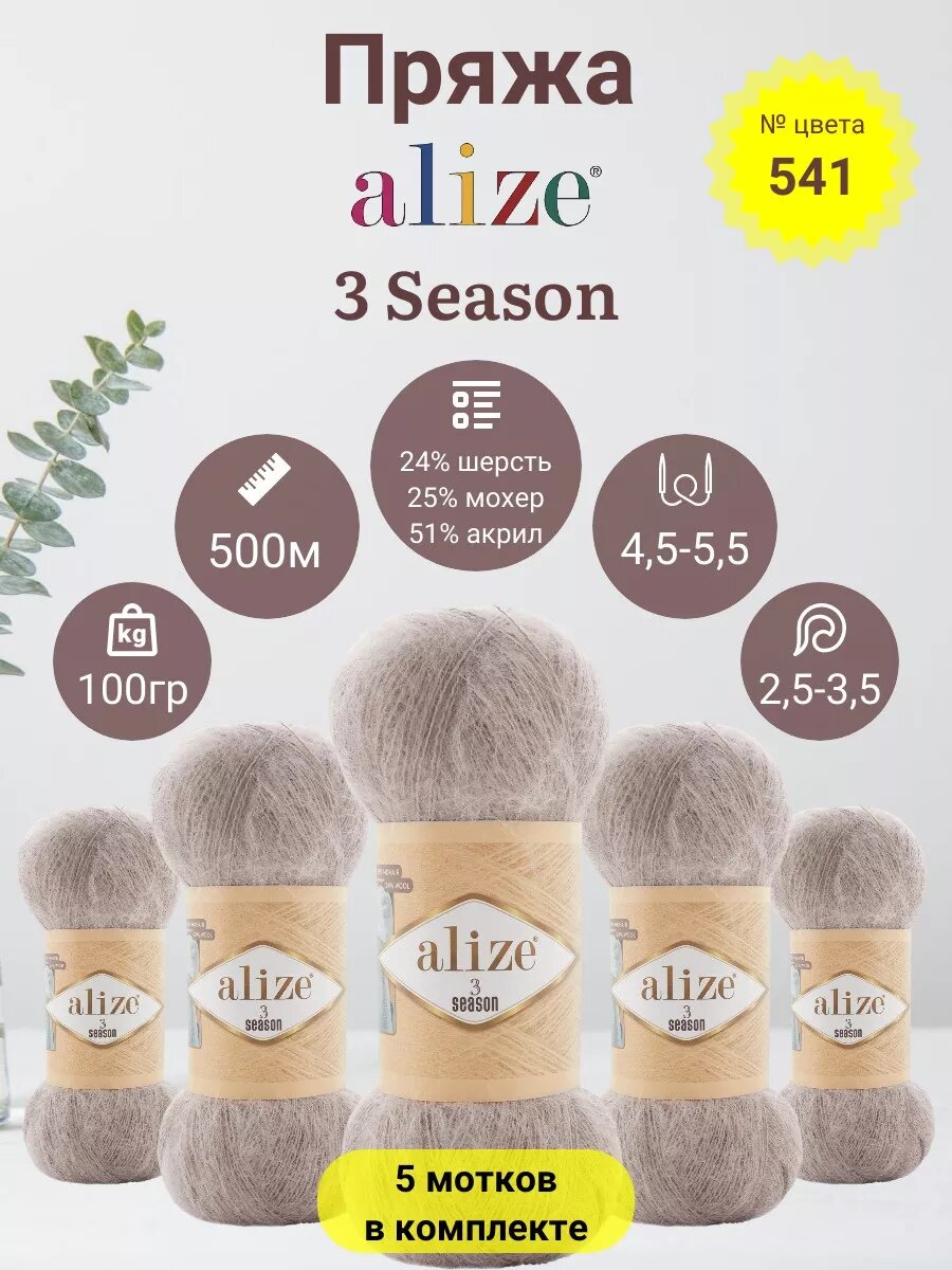 СохранитьПряжа для вязания ALIZE '3 SEASON', 100г, 500м (25% мохер, 24% шерсть, 51% акрил) (541 светло-коричневый), 5 мотков интересное:
