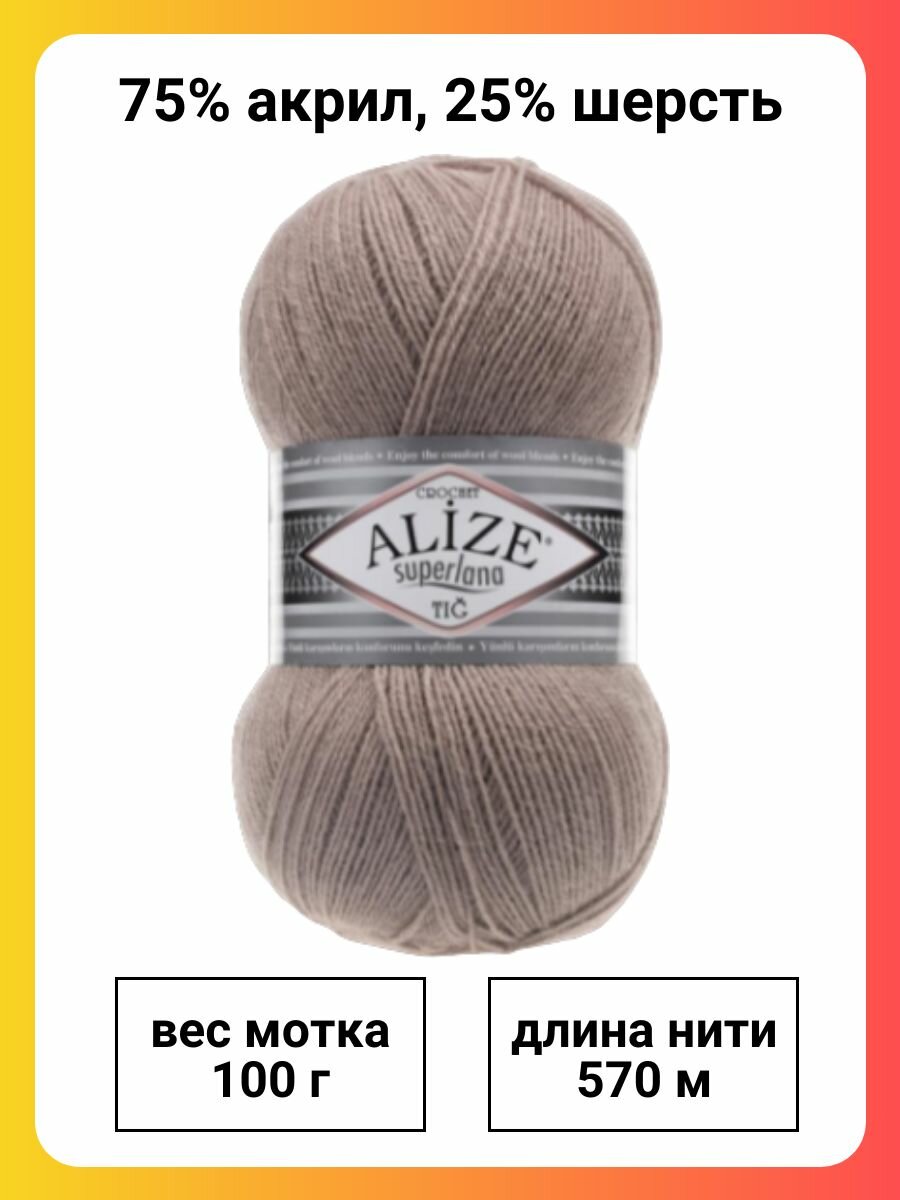 СохранитьПряжа для вязания ALIZE 'Superlana TIG' 100г, 570м (25% шерсть, 75% акрил) (541 норка), 5 мотков интересное: