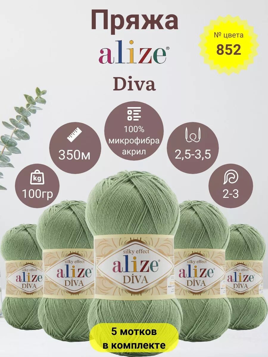 Пряжа Alize Diva полынь (852), 100%микрофибра, 350м, 100г, 5шт