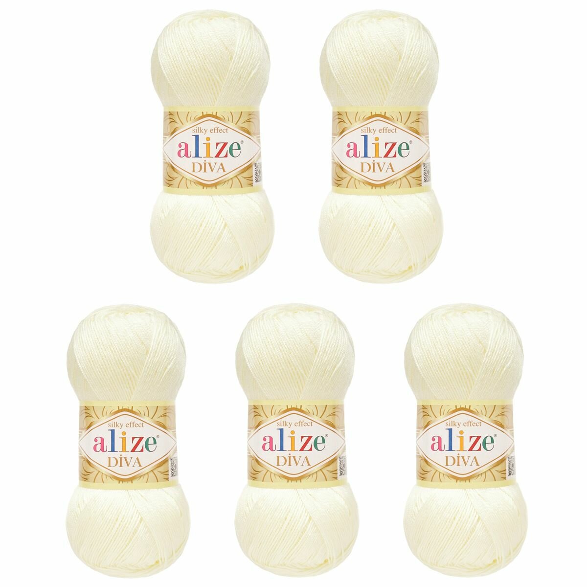 Пряжа ALIZE "Diva", 100 гр 350 м, 100% микрофибра, ТУ 01 кремовый, 5 шт