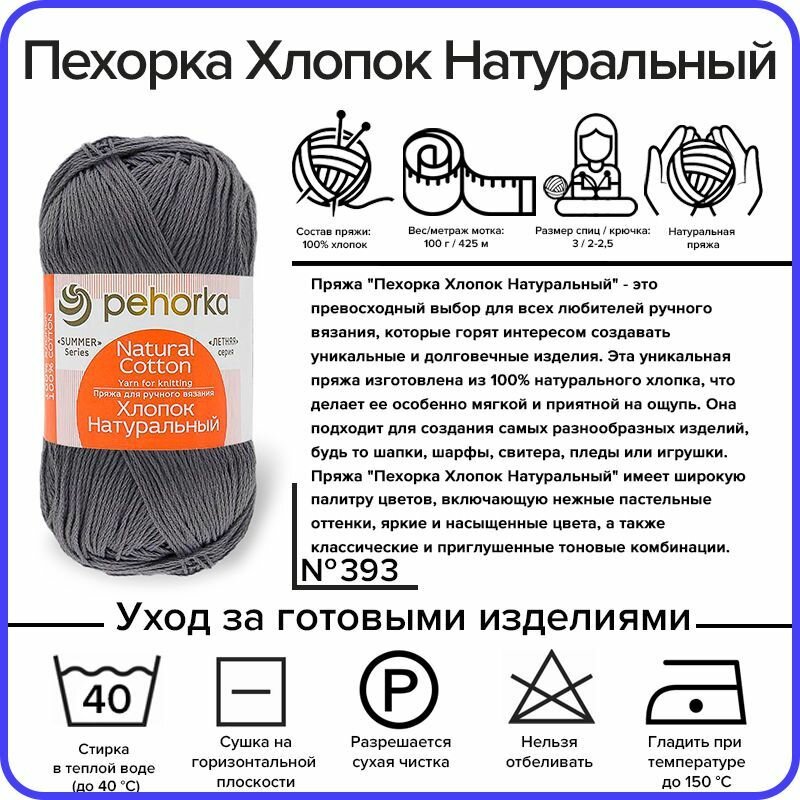 Пряжа Пехорка Хлопок Натуральный, 100 % хлопок, 100 г, 425 м, 02 (черный) 3 мотка