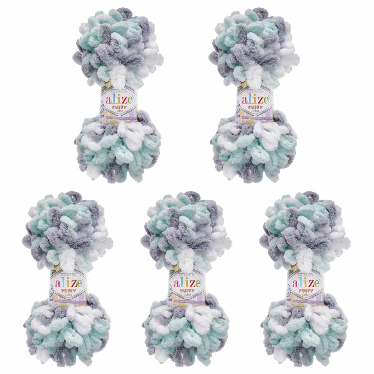 Пряжа Alize Puffy color белый/светло-бирюзовый (6493), 100%микрополиэстер, 9м, 100г, 5шт