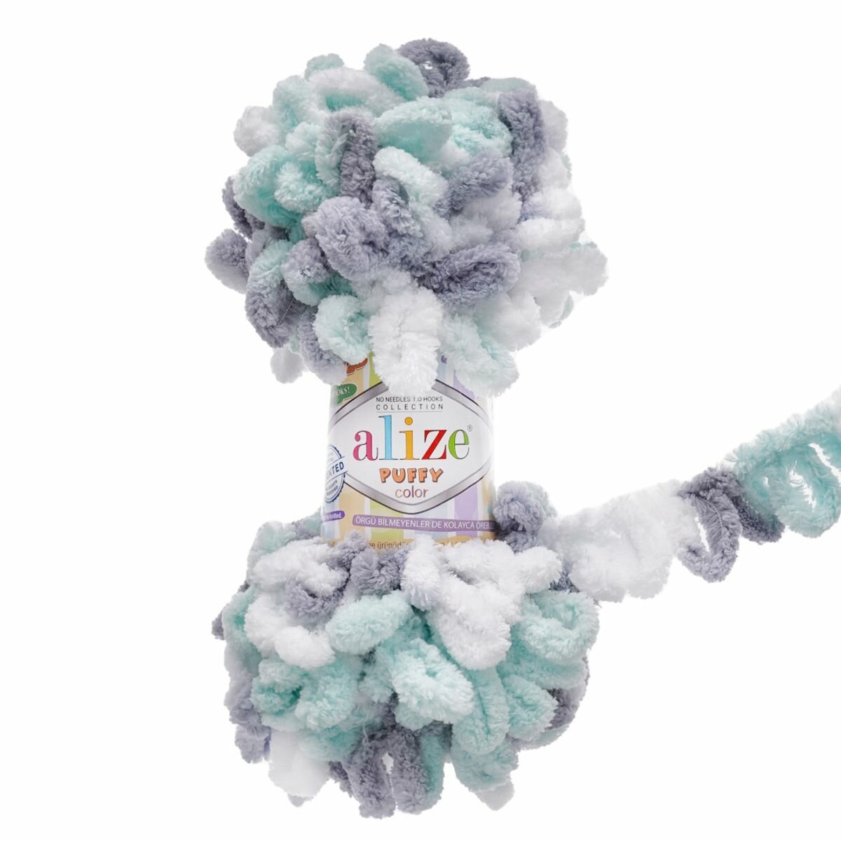 Пряжа Alize Puffy color белый-серый-бирюзовый (6408), 100%микрополиэстер, 9м, 100г, 1шт