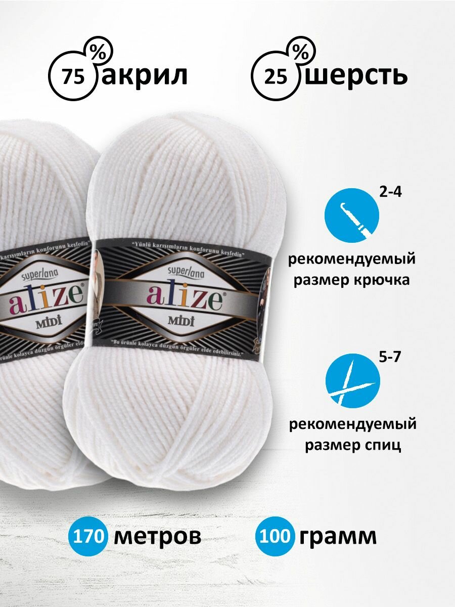 Пряжа ALIZE SUPERLANA MIDI, белый - 55, 25% шерсть, 75% акрил, 5 мотков, 100 г, 170 м.