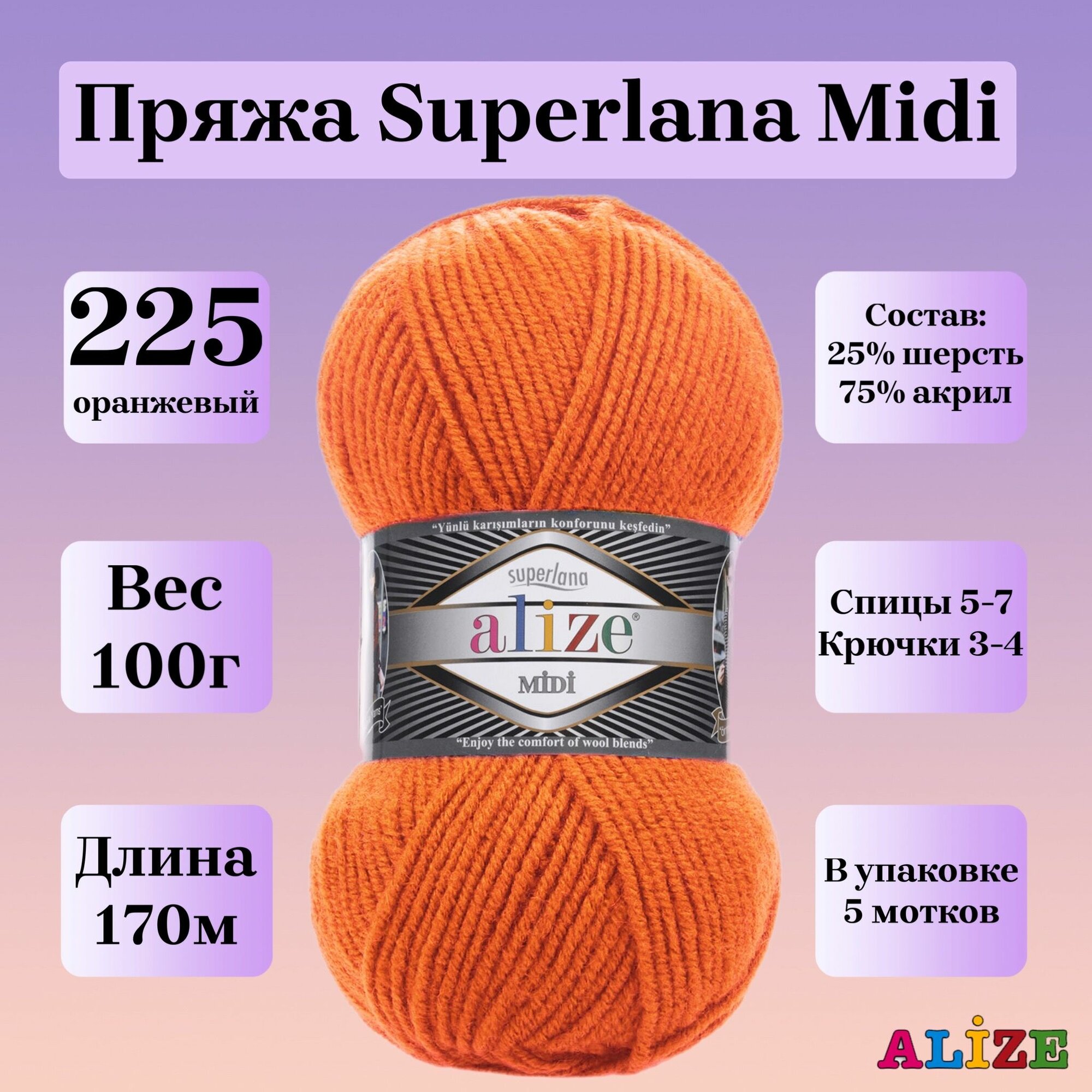 Купить Пряжа Alize Superlana Midi оранжевый (225), 25%шерсть/75%акрил, 170м, 100г, 5шт
