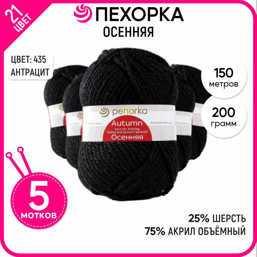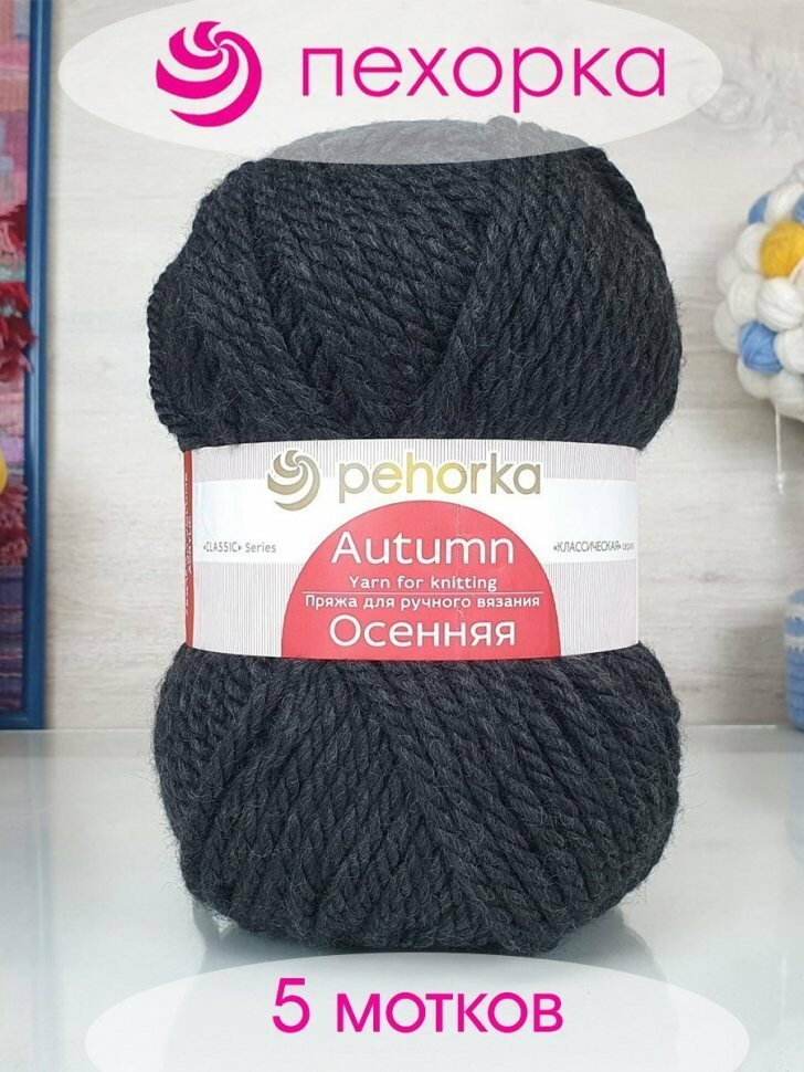 Пряжа для вязания Пехорка 'Осенняя' 200г, 150м (25% шерсть, 75% акрил) (435 антрацит), 5 мотков