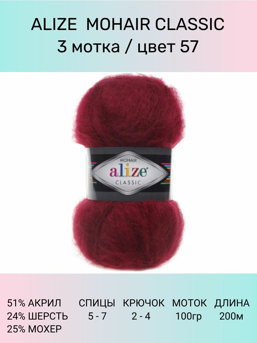 Купить Пряжа для вязания ALIZE Mohair Classic: 57 (бордовый), 3 шт 200 м 100 г, 25% мохер 24% шерсть 51% акрил